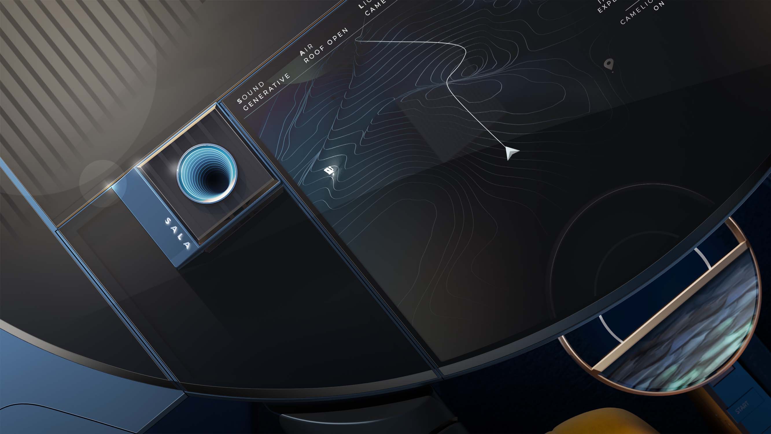 S.A.L.A. is a minimal and smart virtual interface, bringing together the audio, climate control and lighting functions. The driver and passengers can therefore adjust the car’s interior environment simply by tapping a button, or even with the sound of their voices.