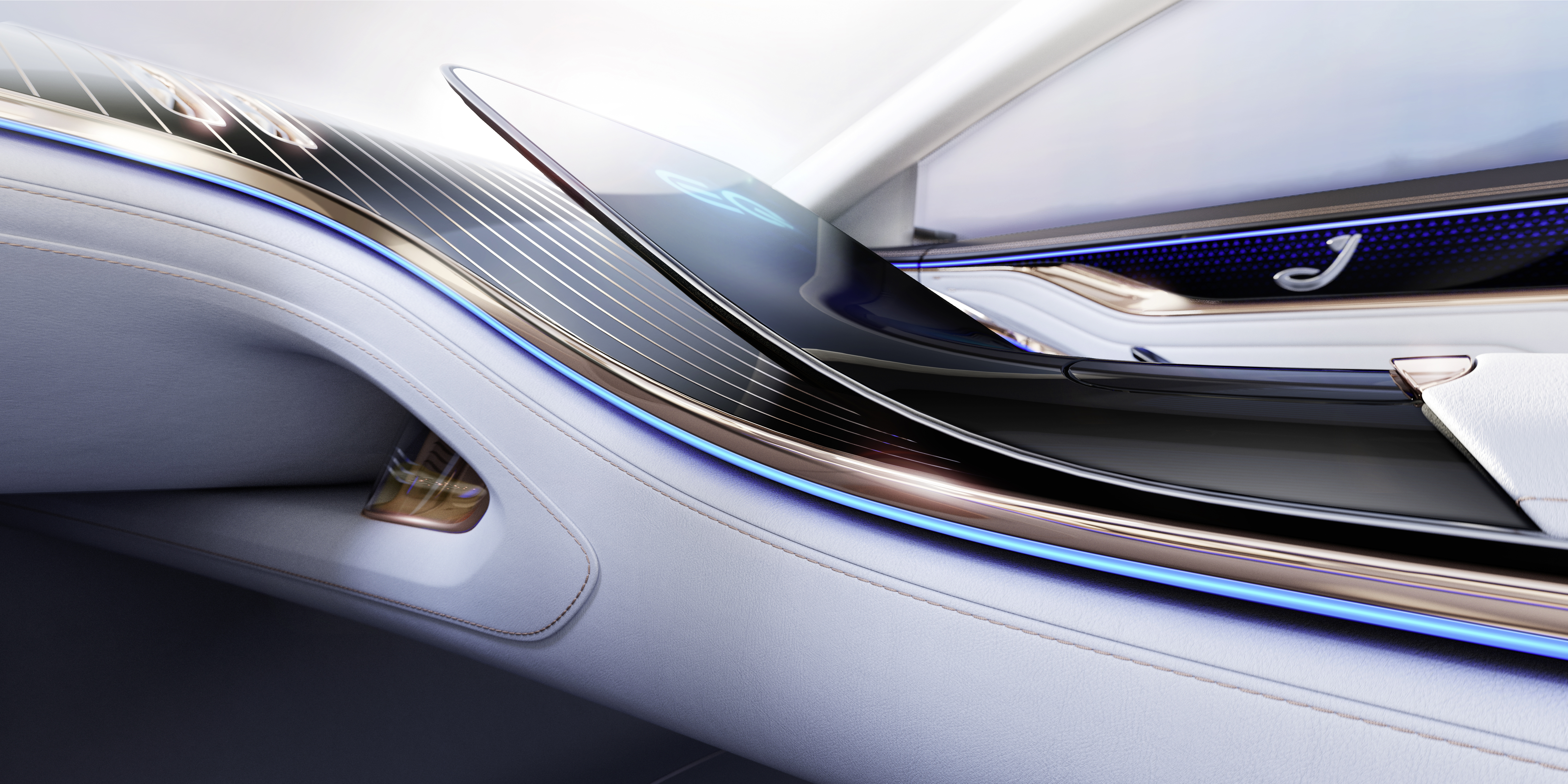 The VISION EQS presents a large interior sculpture as a stage for the future: digital content can be experienced by immersion over the entire surface, creating an all-embracing atmosphere. The blending of materials and information illustrates a possible intuitive interaction in the future.