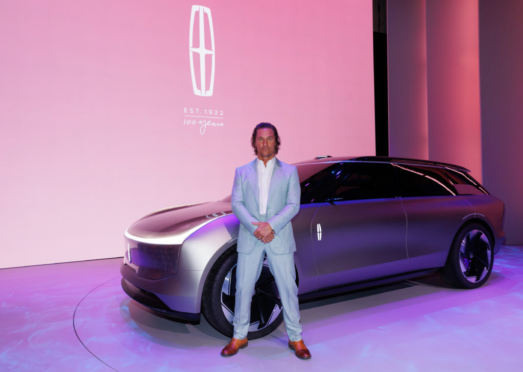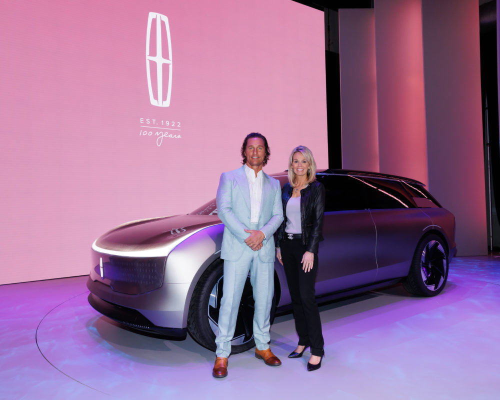 The Lincoln Star Concept made its global debut at the brand’s Centennial Celebration event in Los Angeles the evening of April 20, 2022. The Lincoln Star Concept serves as inspiration for the brand’s fully electric vehicles coming in the future. Lincoln also announced it will deliver three new fully electric vehicles by 2025 and a fourth by 2026 as their electrification journey continues. LOS ANGELES, CALIFORNIA – APRIL 20: Joy Falotico and Matthew McConaughey speak on stage at the Lincoln Centennial Celebration on April 20, 2022 in Los Angeles, California. (Photo by Rich Polk/Getty Images for Lincoln)