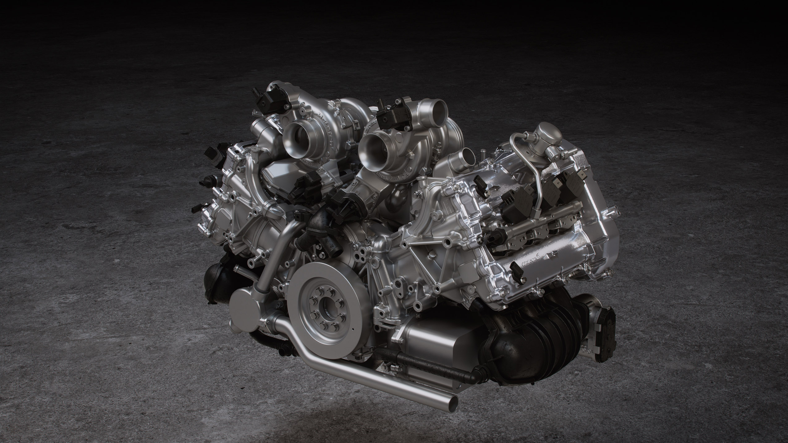 Designed to run with a Gasoline Particulate Filter to optimize emissions performance, the M630 engine is also extremely refined. The 120° v-angle of the engine, which allows the turbochargers to be positioned within the ‘hot vee’, delivers further advantages in packaging as well as contributing to a lower center of gravity. The 120° layout increases engine performance by reducing the pressure losses through the exhaust system and allows for a stiffer crankshaft that enables a rev limit of 8,500rpm, maximizing performance and driver engagement.
