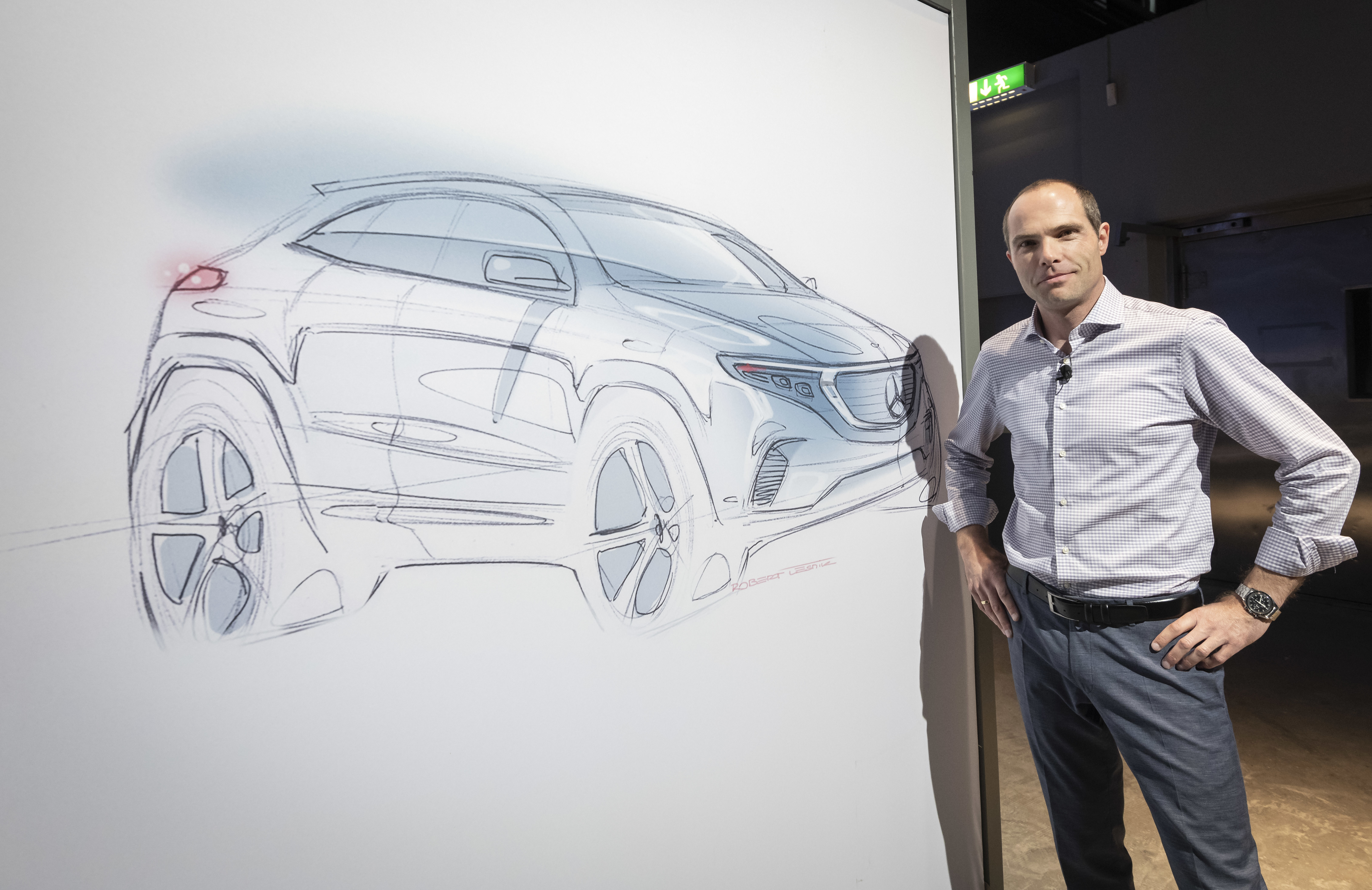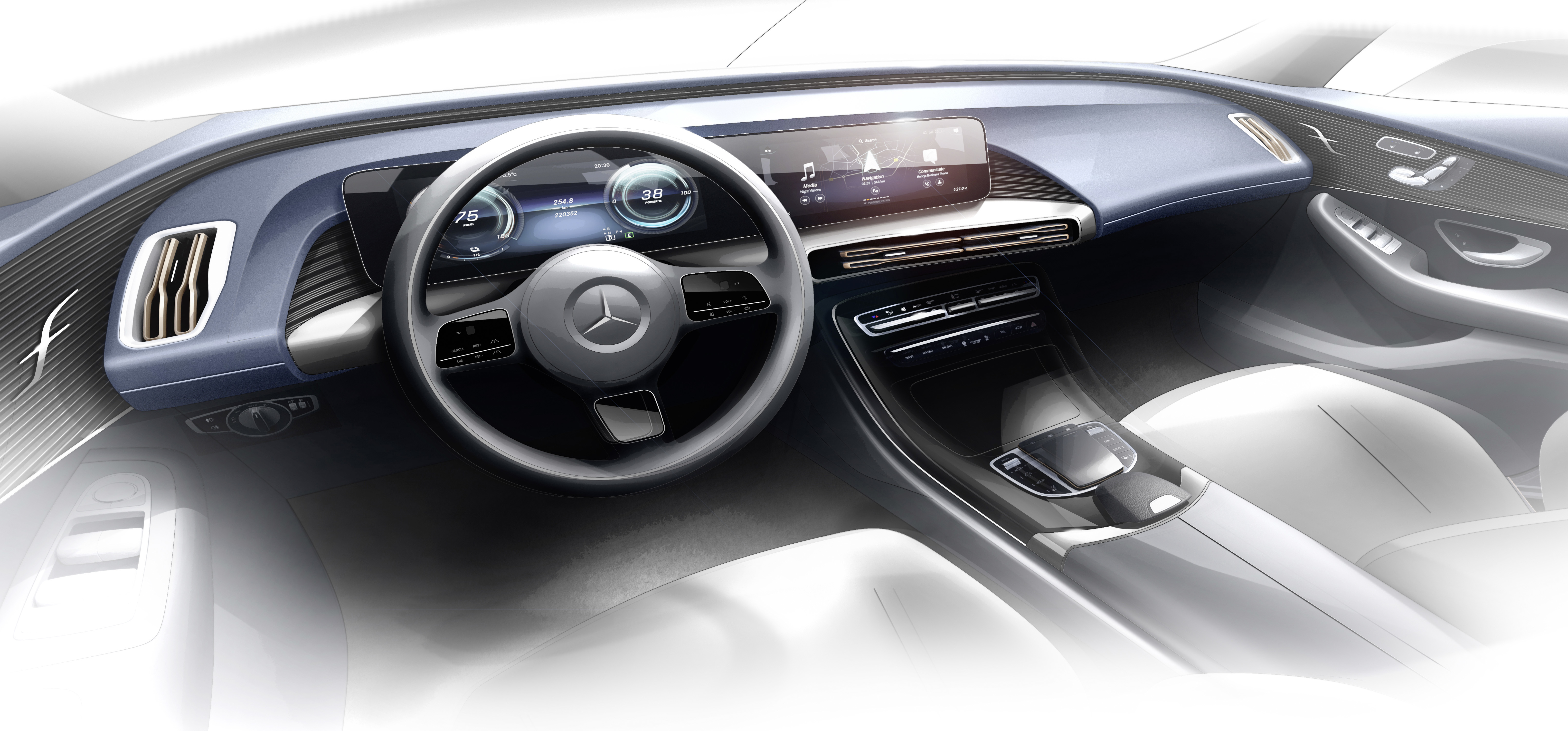 Der neue Mercedes-Benz ECQ, Exterieur, Designskizze;Stromverbrauch kombiniert: 22,2 kWh/100 km; CO2 Emissionen kombiniert: 0 g/km, Angaben vorläufig* The new Mercedes-Benz EQC, exterior, design sketch;combined power consumption: 22.2 kWh/100 km; combined CO2 emissions: 0 g/km, provisional figures*