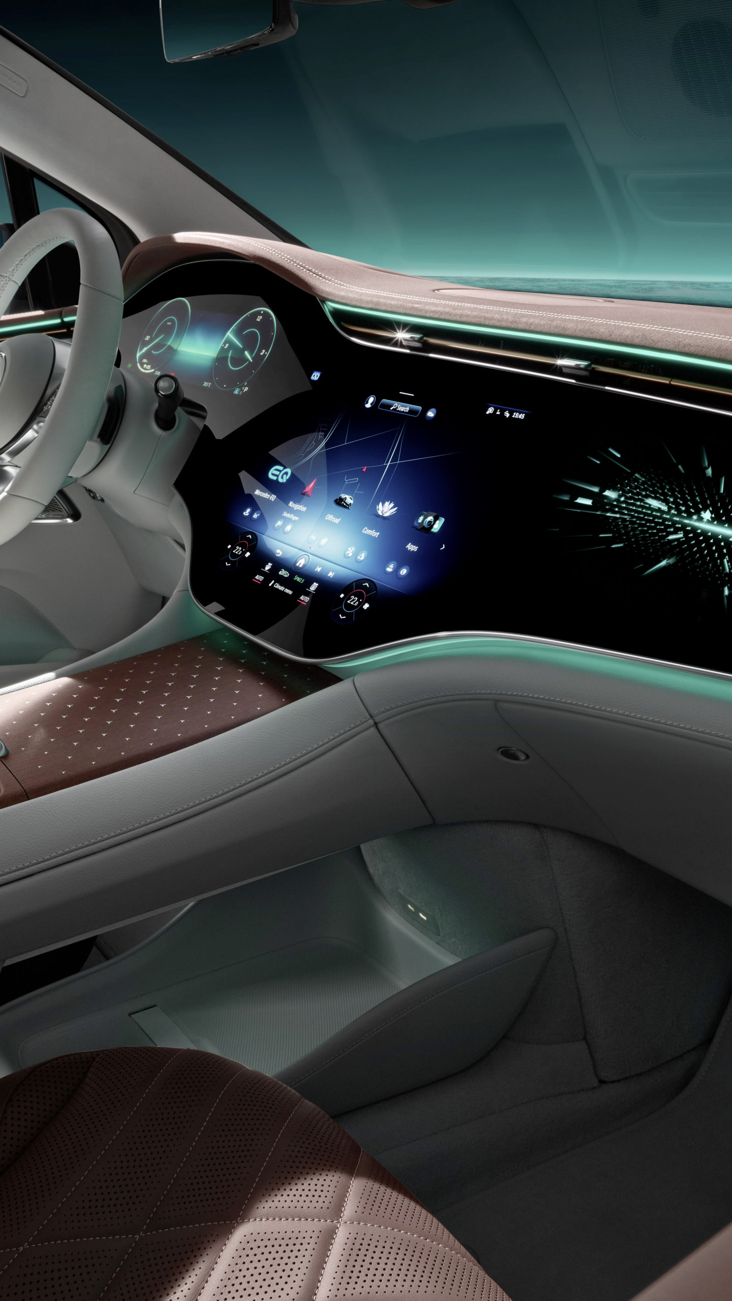 The EQE SUV is based on the large electric platform from Mercedes‑EQ. On top of this it boasts an interior that has been consistently digitalised. The optionally available MBUX Hyperscreen implements this vision to impressive effect. The standard Electric Art interior does not make use of any leather at all.6