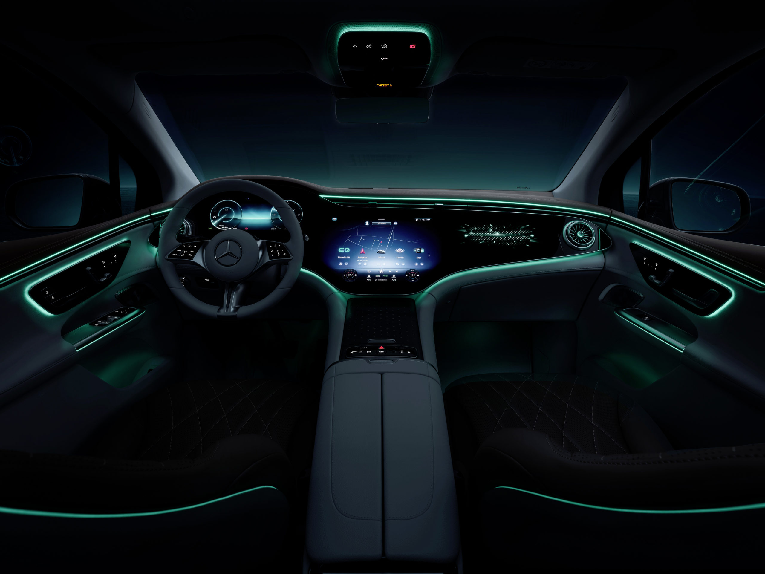 DIGITAL LIGHT headlamp technology (special equipment) makes innovative functions possible, such as the projection of auxiliary markings or warning symbols onto the road. Another equipment highlight is ENERGIZING AIR CONTROL Plus. A HEPA (High Efficiency Particulate Air) filter cleans the incoming outside air at its very high filtration level. ENERGIZING COMFORT links together various comfort systems in the vehicle. The individual ENERGIZING COMFORT programmes enable a special feel-good programme depending on the mood or needs of the customer. This enhances physical comfort and performance while driving and during a break. The Dolby Atmos sound formatÒ takes the audio experience in the EQE SUV to a new level.