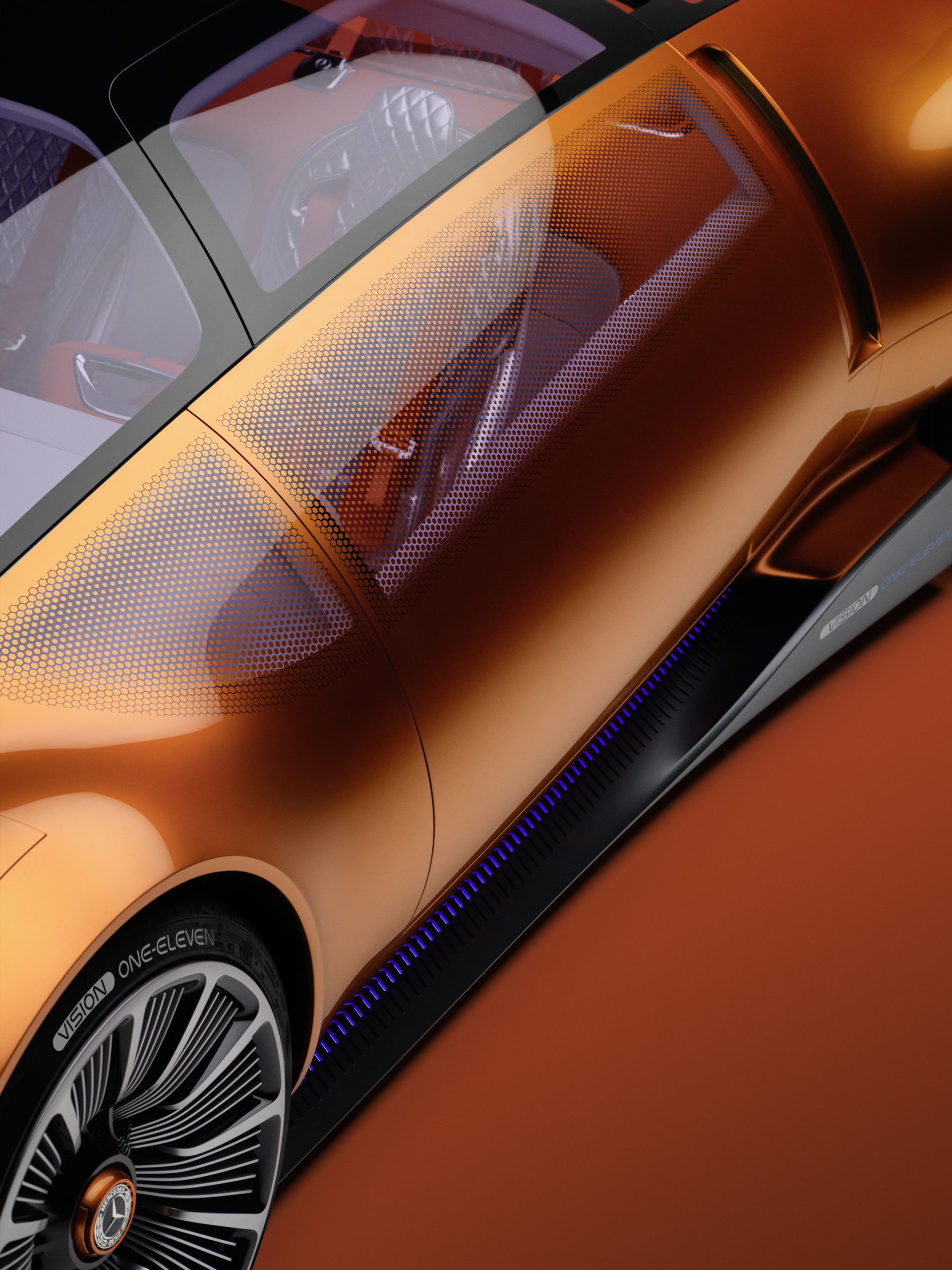 Another striking contrast arises through the very low-slung front and rear skirts finished in matte black. The two deeply scooped aerodynamic elements are visually connected by two blade profiles in the same colour running along the flanks beneath the sills. These profiles feature piercings that are backlit in blue. The functional aerodynamic elements also serve as a further design reference to the C 111, which is painted black on the lower portion of its bodyshell. The dark “keel line” of the Mercedes-Benz Vision One-Eleven generates an impression of seamless transition between the vehicle and the ground beneath it that is even more powerful than that of the C 111. The form of the car appears fused with the road surface.