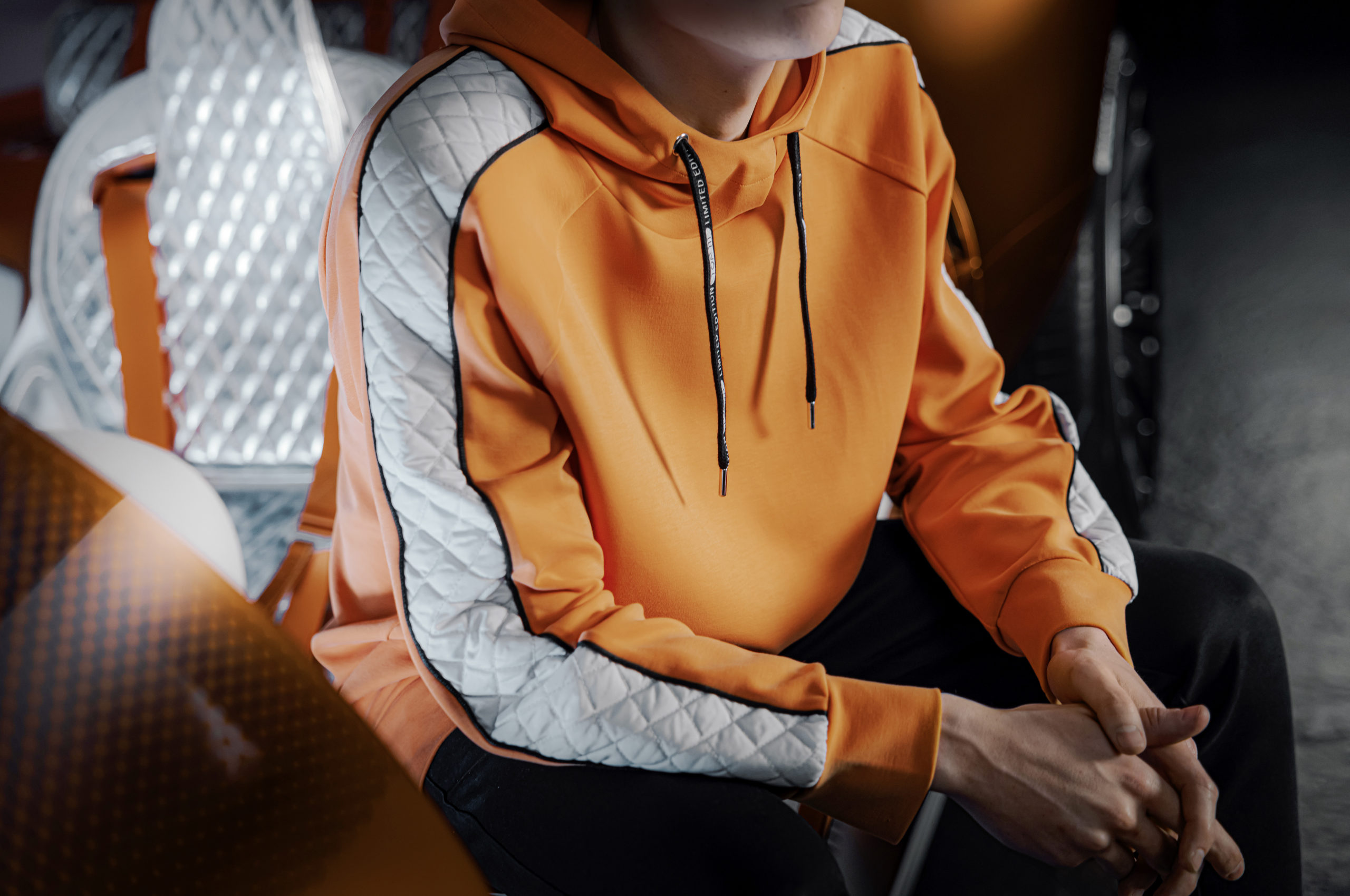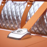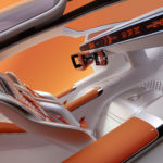 The interior design of the Vision One-Eleven reflects future luxury based on a progressive colour concept and extraordinary material combinations. The richly contrasting colours and materials attract attention at first glance: Large surfaces such as the dashboard are upholstered in white fabric displaying a tech-look honeycomb structure. The material is made from 100-percent recycled polyester. Other elements such as the armrests on the sills and centre console, as well as the rear parcel shelf beneath the expansive rear windscreen, are clad in bright orange leather. This creates a smooth transition from interior to luggage compartment. The sustainably processed leather was tanned using coffee bean husks. Polished aluminium in the steering-wheel spokes and inlaid as straps across the armrests underscore the tech look and feel. The same applies to the brake and accelerator pedals, both of which are made from polished aluminium and floor mounted.