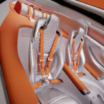 Otherwise, the interior equipment in the Mercedes-Benz Vision One-Eleven has been reduced to a minimum. Like the exterior, the task here too was to keep the number of add-on features to a bare minimum. The seats are good examples as they don’t follow the classic format. Instead, the seat cushions are integrated flush-fit into the floor. This creates the initial impression of the bucket seat in a Formula 1 race car. The orange four‑point harness and its high-gloss polished buckle further reinforce the sporting character.