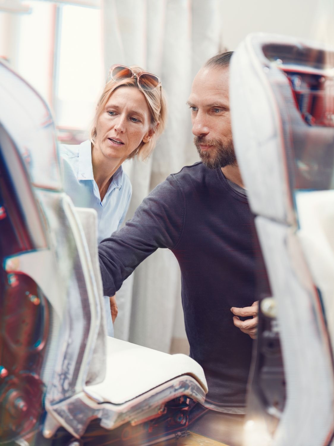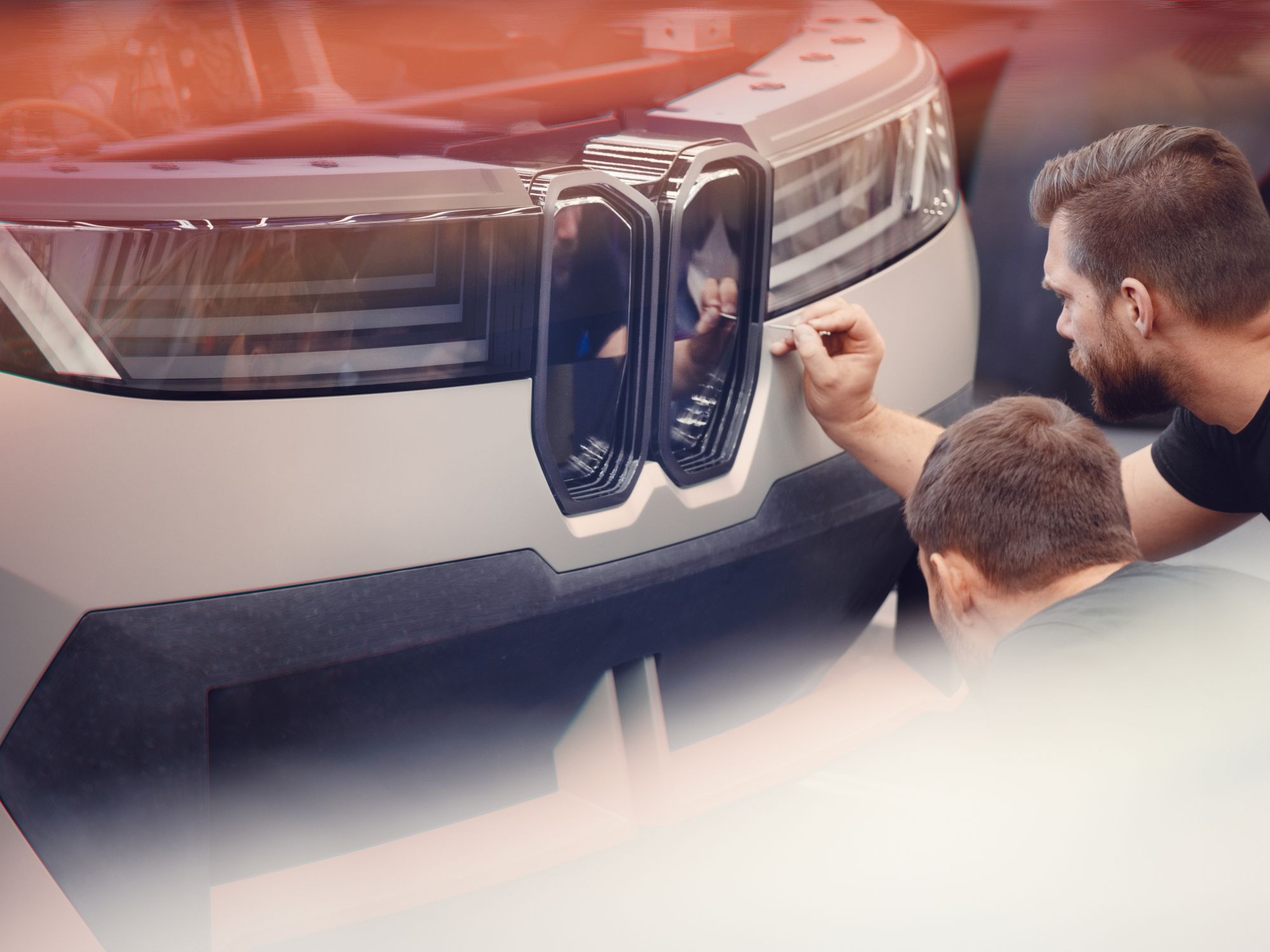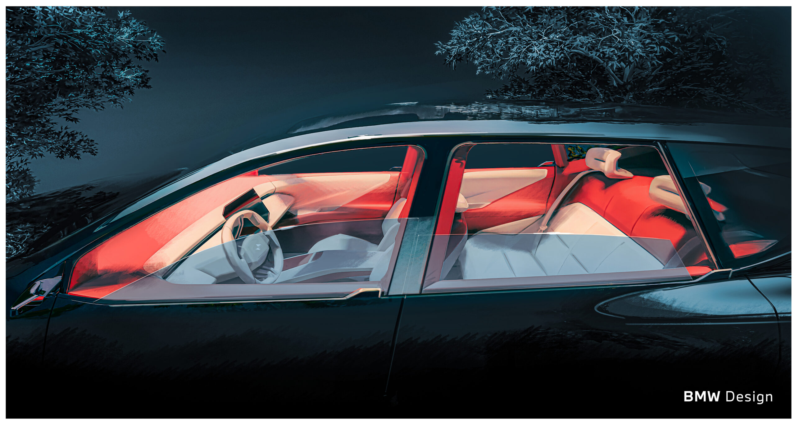In combination with the two-box design of a BMW X model, the pared-down design language developed for the Neue Klasse also represents a major leap forward in both exterior and interior design. With its increased ground clearance, the fully-electric vehicle architecture offers new possibilities for an even more spacious interior. It allows for a long wheelbase, short overhangs and classic BMW proportions. Large window areas and the panoramic glass roof flood the interior with natural light, creating an airy spaciousness that is complemented by textiles in warm colours.