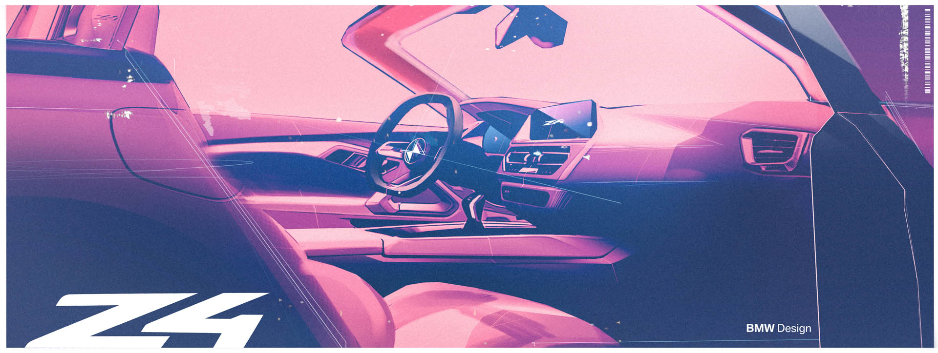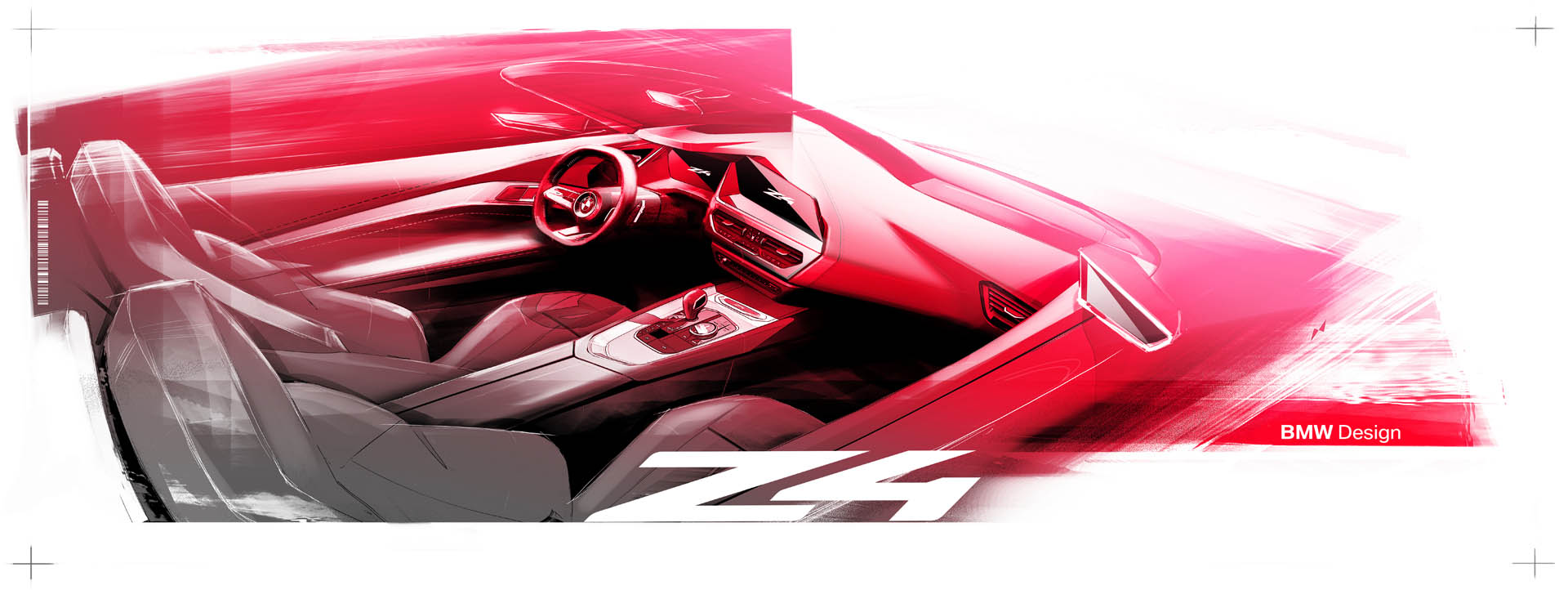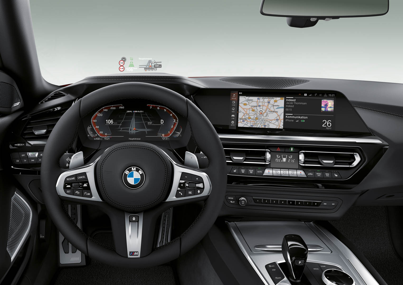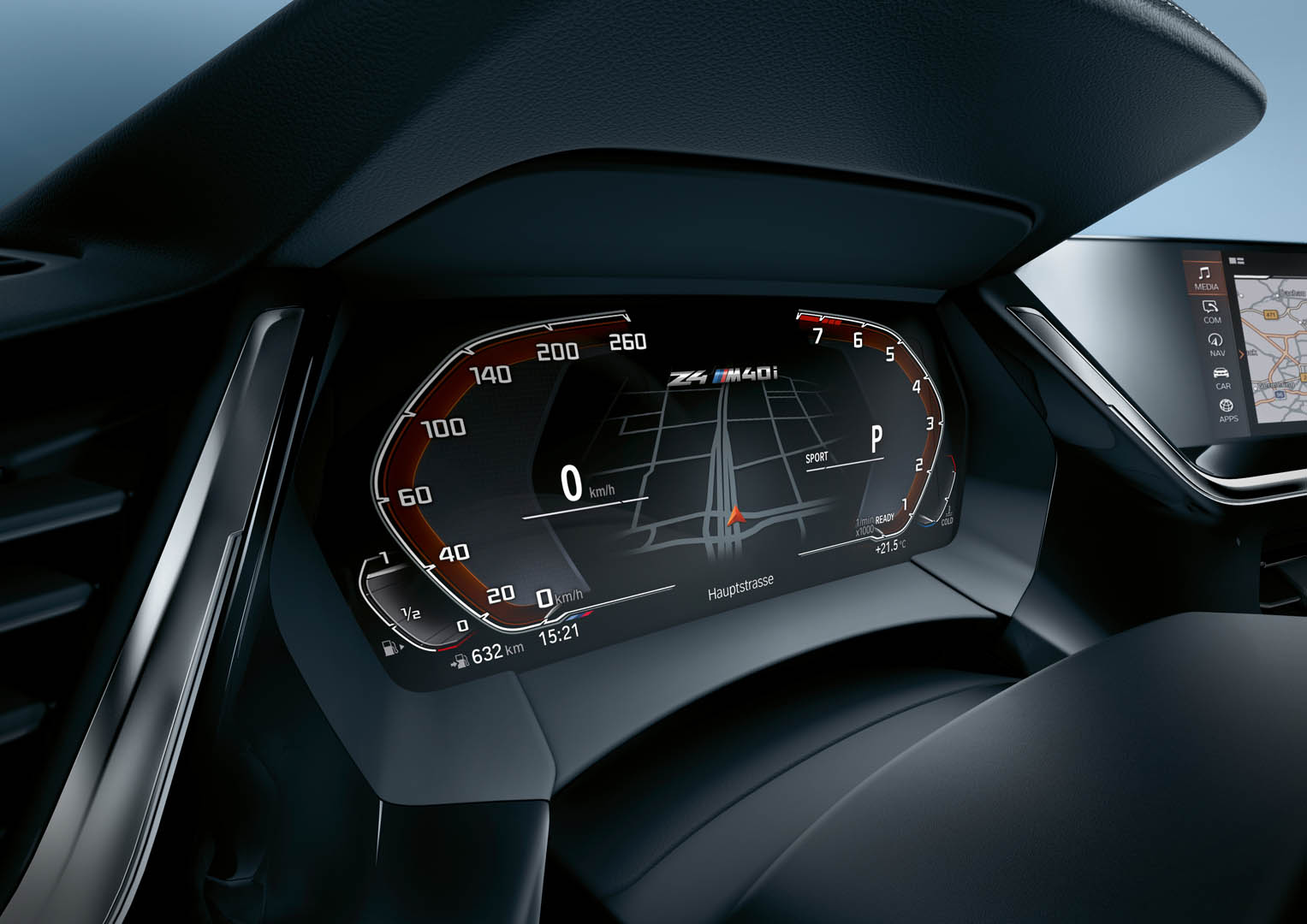 Vertically stacked headlights, the BMW kidney grille sporting a mesh design, the long clamshell hood stretching over the front wheels, large air breathes on the front wheel arches and the distinctive spoiler integrated into the rear lid all contribute towards the characteristic look of the new BMW Z4. The design of the interior places the focus on the pure sports driving enjoyment of the new BMW Z4. The driver-oriented cockpit styling is underscored by dynamic forward-oriented lines. Likewise, the clearly structured arrangement of all control elements enhances the focus on the driving experience inside the new BMW Z4.