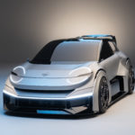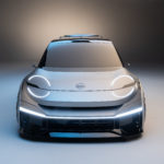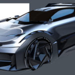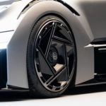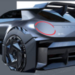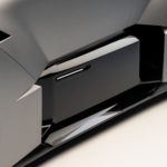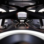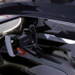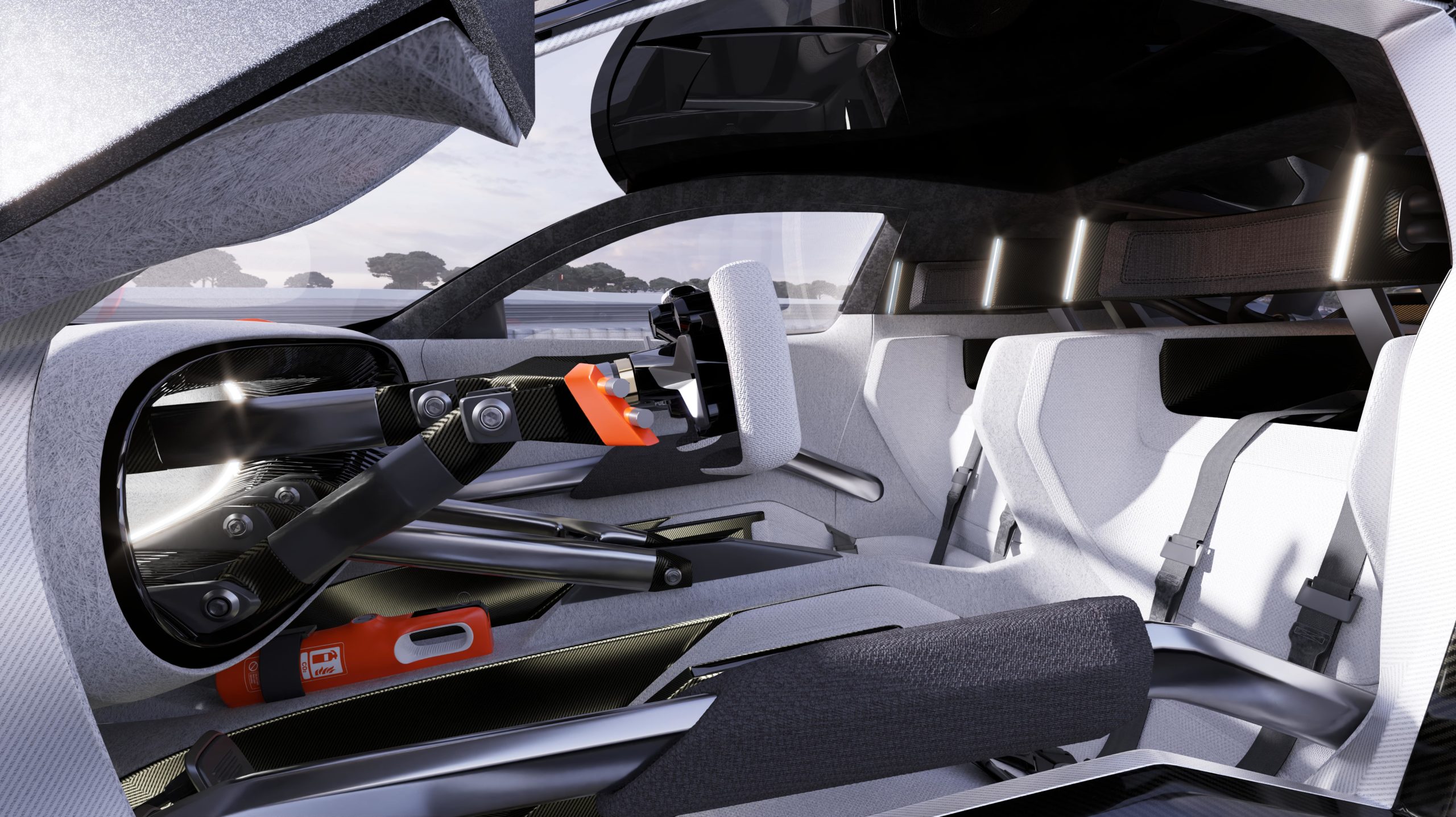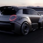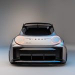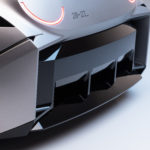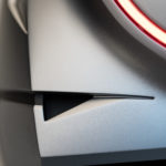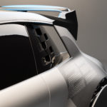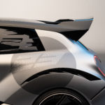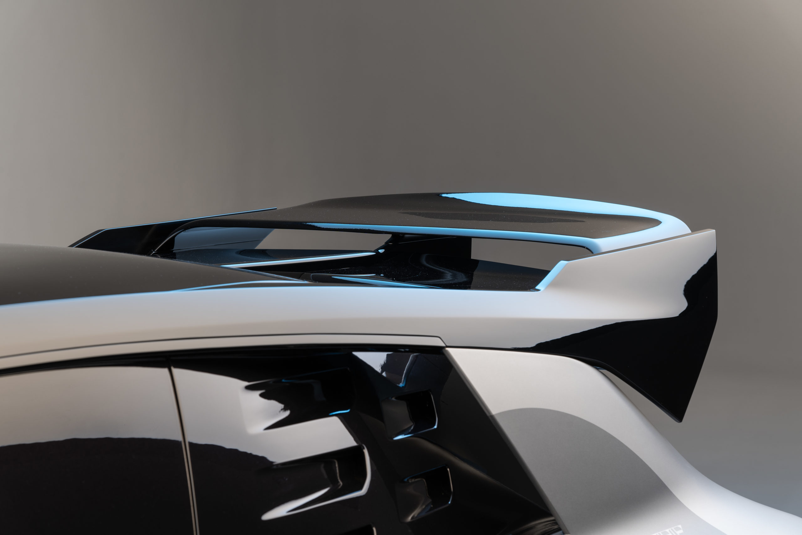 Like the front, each of the rear lights consist of a thin upper and lower semi-circle LED which contrast with the squared off forms of the lower portion which is defined by fiercely functional shapes to manage the airflow and to maximise the creation of downforce as the air escapes from under the car. The full width of the car is emphasised by a horizontal bar below what looks like a soft smile that defines the outline of rear hatchback.