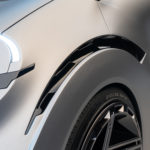 The curvature of the wheel arches finish abruptly at the level of the lower door where angular intersections frame the air outlet behind the front wheel. And the same angular slits on the rear wheel arches allow the airflow to cool the rear brakes. The extended skirts hug the body side on the lower portion of the car.