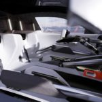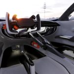 Once in position, the driver is greeted by a long extended steering column which culminates in a rectangular sports steering wheel festooned with multiple controls and adjustments. Paddles to adjust the electric powertrain performance and additional switches are within fingertip reach behind the wheel.