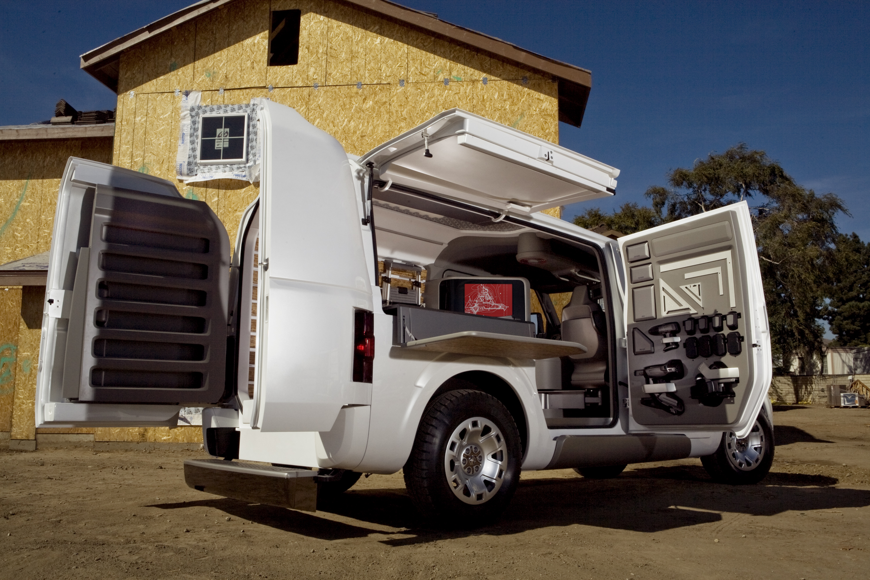 The NV2500 Concept’s “wall-less†mobile office/workspace design includes a computer workstation, fold-down conference table, numerous storage compartments, cargo/tool tie-down racks, nearly six feet of interior height and an awning-style side panel that opens to create a standing outside workshop table.