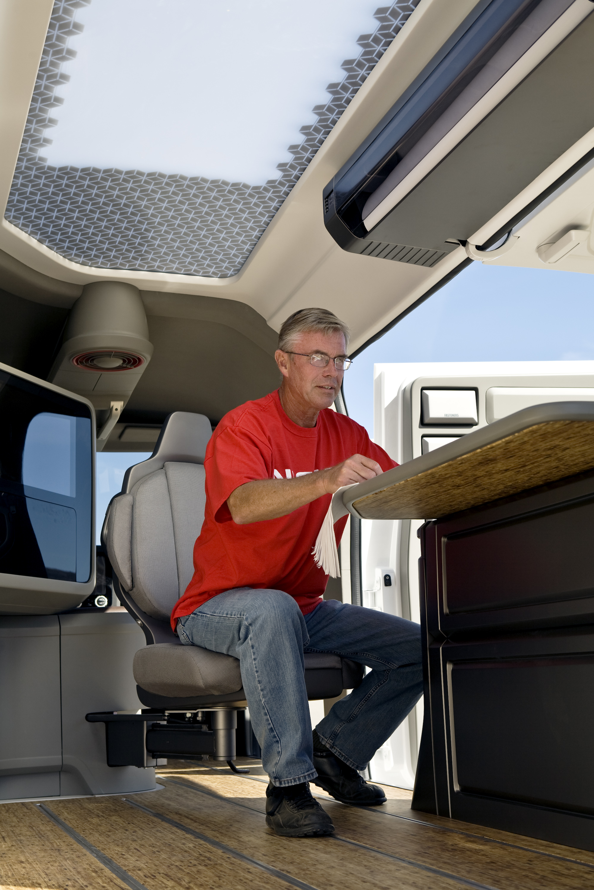“The passenger seat functions as both a traditional forward-facing seat and a comfortable, swiveling desk chair,†said Campbell. “All elements of the interior are designed to be multi-functional and highly durable, able to stand up to the rigors of heavy use at a job site or other real world locations.â€