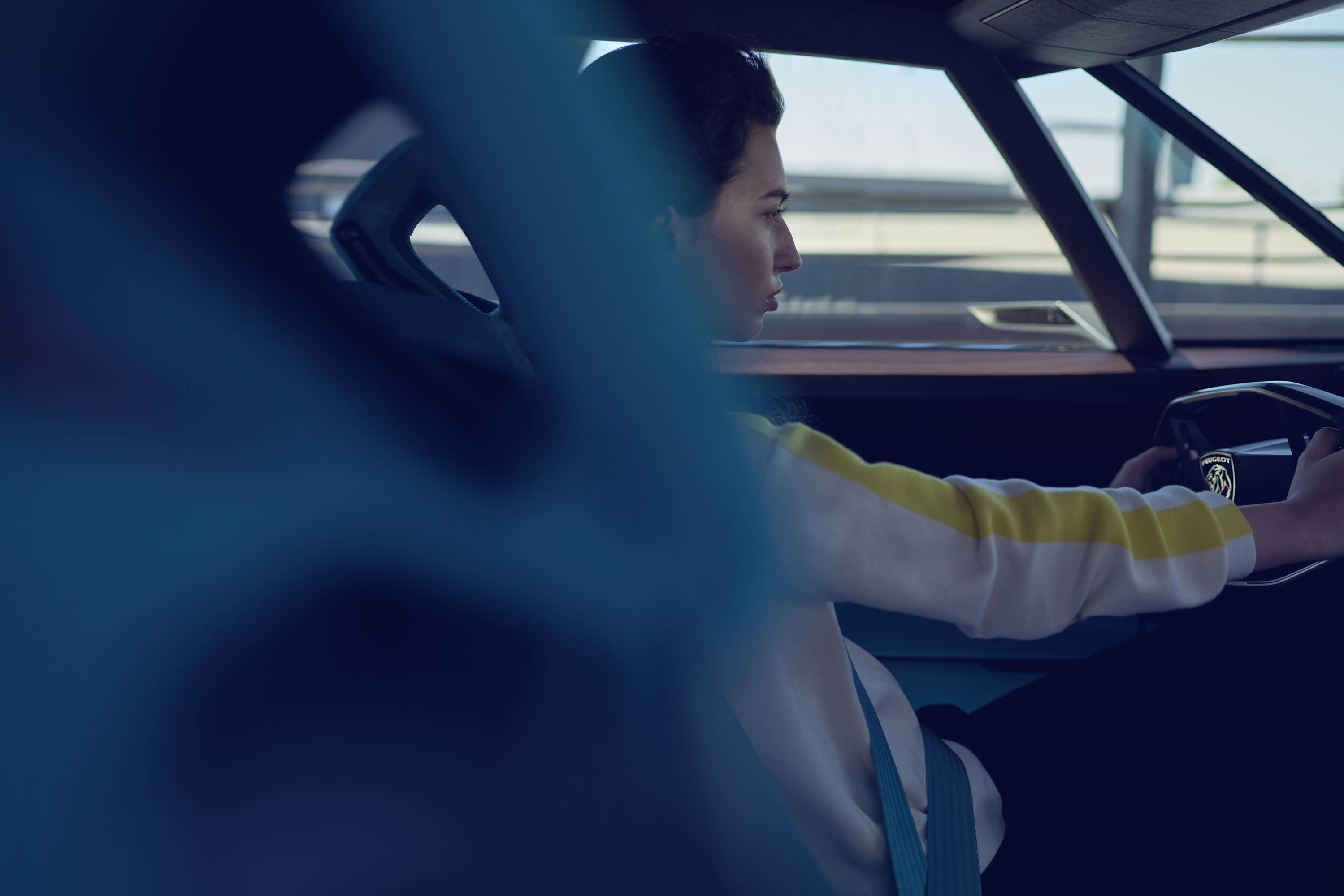 The design of the H seats and the vertical padding are inspired by the PEUGEOT 504 Coupé: more volume with the most compact dimensions possible, comfort fit combining ease and stimulating support thanks to the use of shape memory foams (like a tailored suit). The headrests are crossing, adjustable or fully retractable and integrated into the seat.