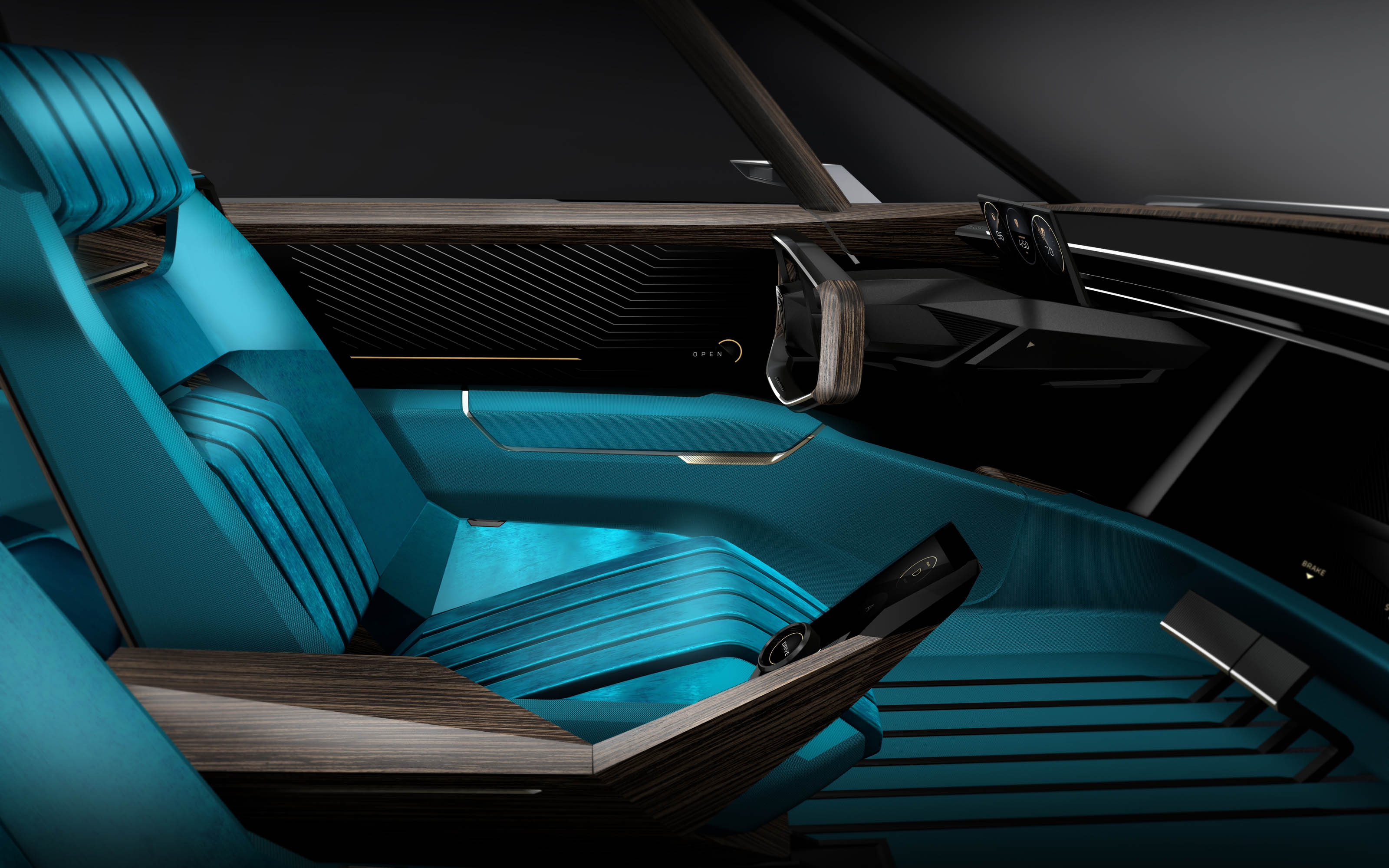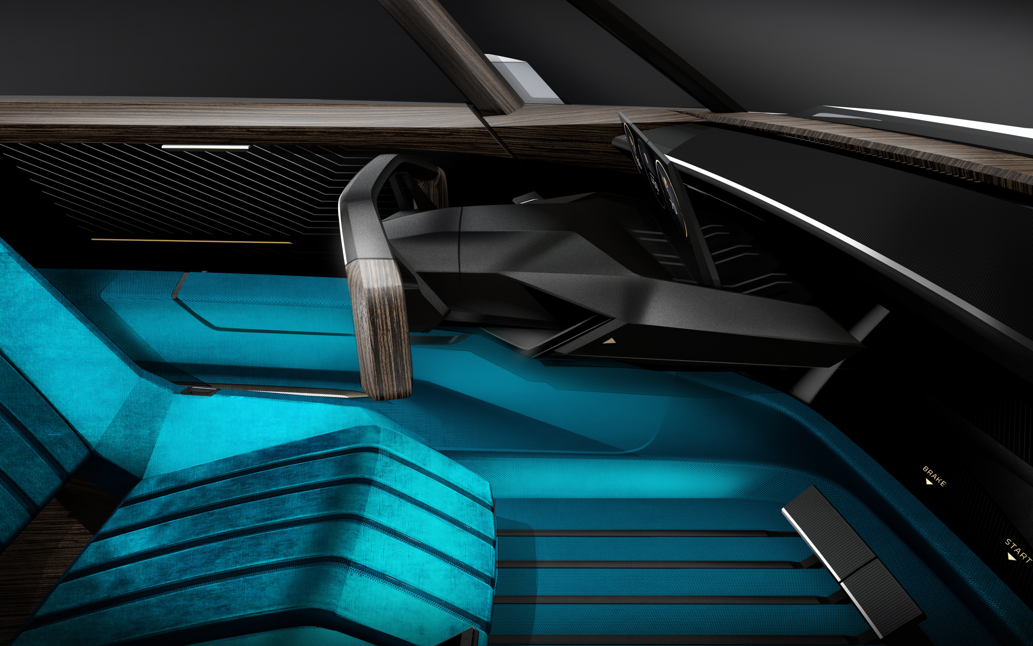 The upper parts and doorways are made from Paldao wood by our partner HERVET MANUFACTURIER®. Made from renewable forests, this exotic wood is very reminiscent of the furniture of the 60s in rosewood or ebony. The dark veins of this variety bring out the turquoise blue on the seats and the floor. This modern interpretation of the wood is reminiscent of the GT finished dashboards in PEUGEOT 3008, 5008 and 508.