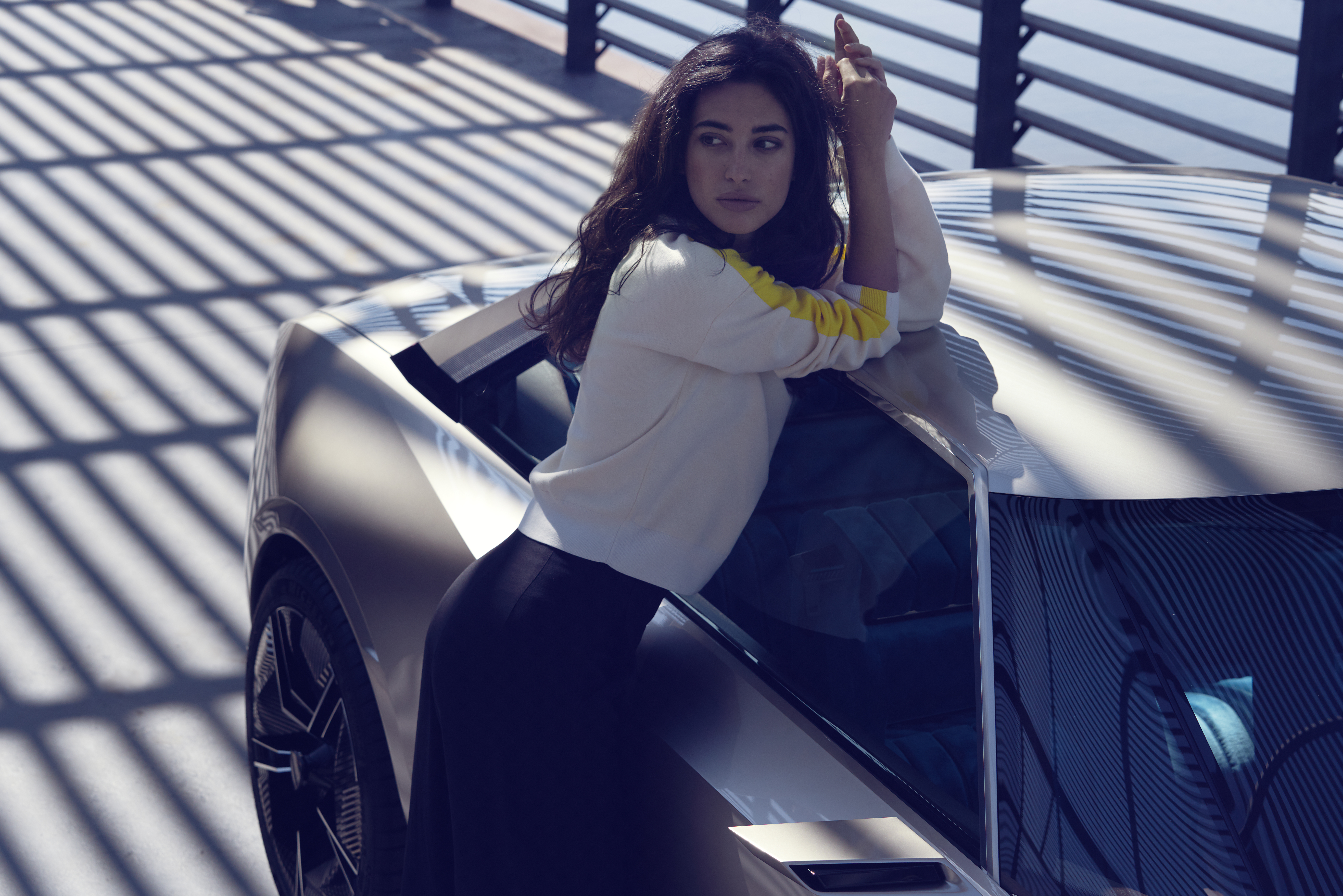 - thanks to the by wire steering technology, the steering wheel retracts under the sound bar in order to fully clear the 49-inch screen,