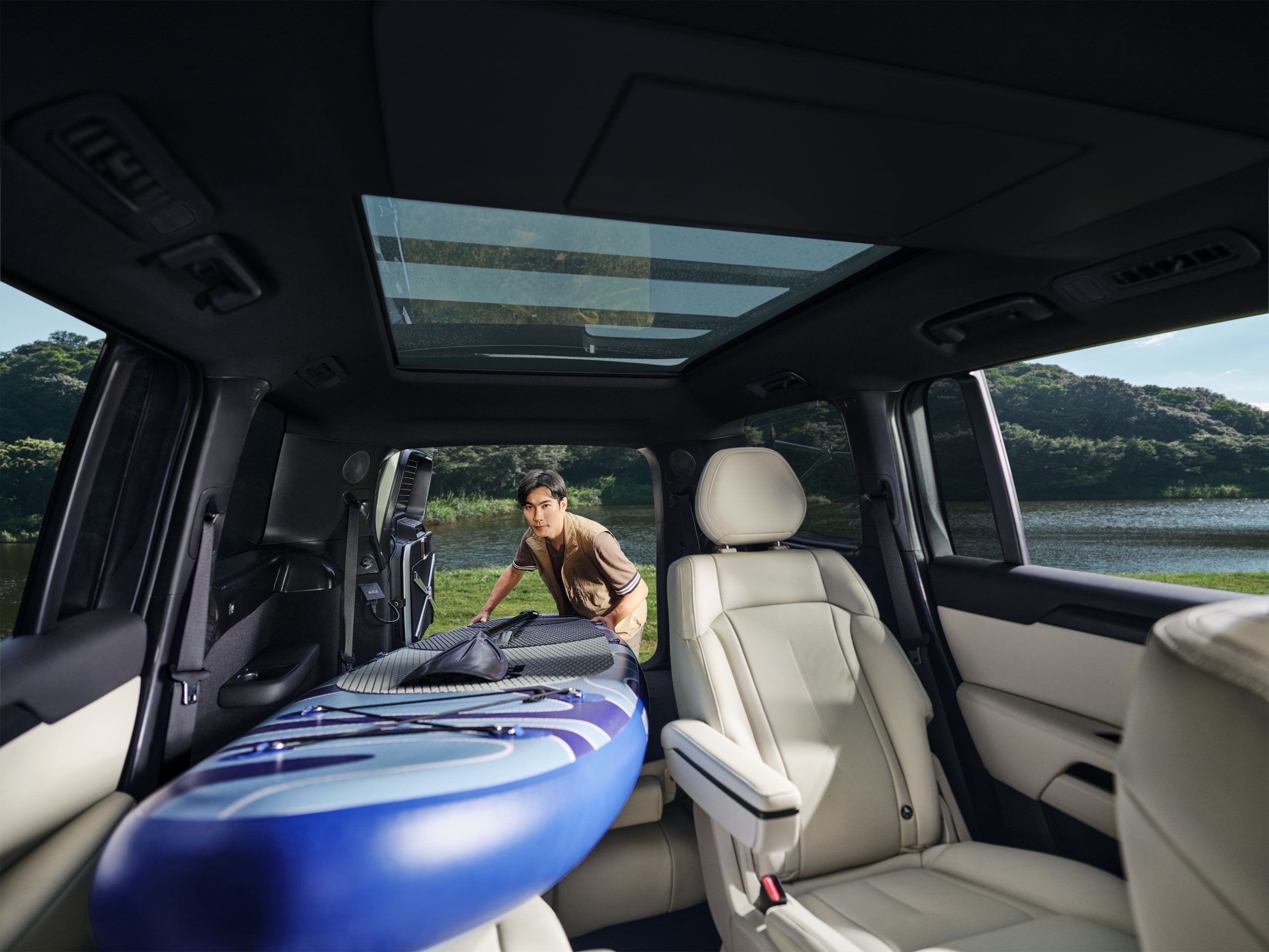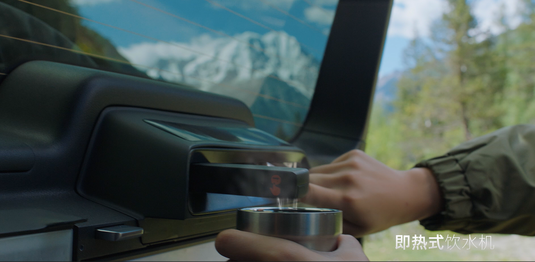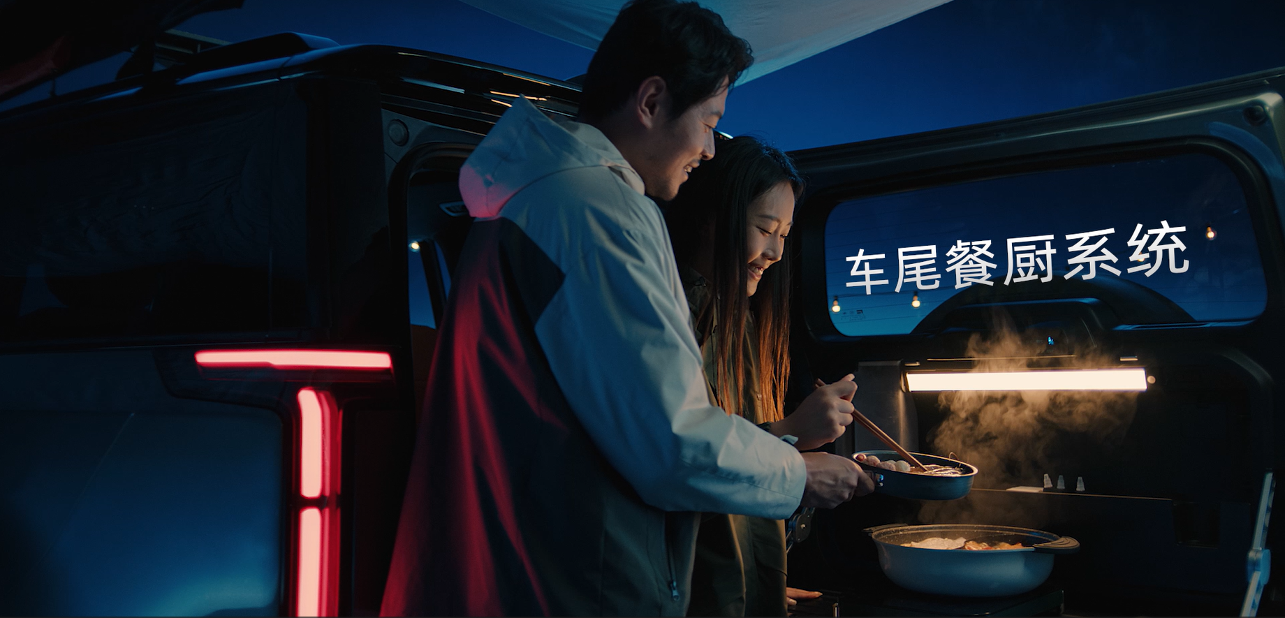The SUV for the next generation of freedom-seeking road families is available in two configurations: a versatile 7-seater version and a premium 6-seater version adorned with ultra-luxurious airline seats in the second row. Among its standout features is an industry-first rear-end restaurant system integrated into the rear door. Unfolding this innovative feature reveals a compact kitchen workspace complete with a water dispenser and an exclusive induction cooker, which can be powered through a 220V external discharge interface. The kitchen also offers ample storage for a comprehensive set of outdoor dining utensils.