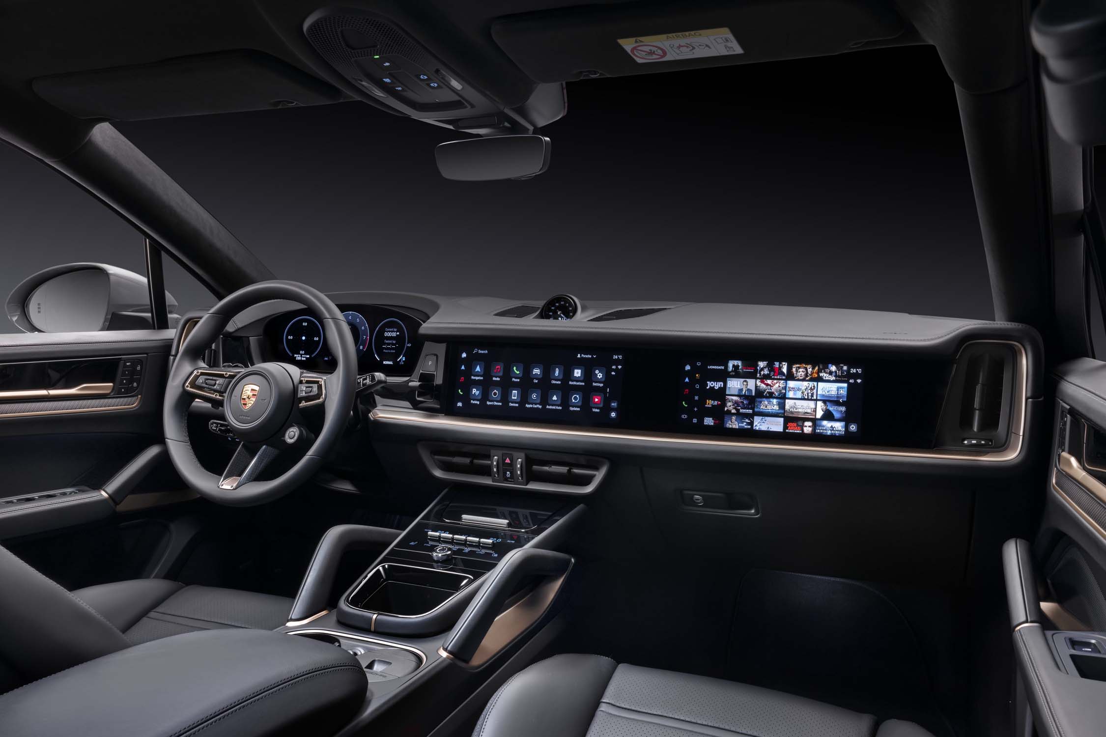 the relevant vehicle functions. Native apps such as Spotify® and Apple Music® are provided to optimise connectivity in the new Cayenne. A 10.9-inch display is now available for the first time for the passenger side. This enriches the front passenger’s driving experience by displaying performance data, providing separate access to the infotainment system controls and, depending on the market, the option of streaming video content on the road. A special foil ensures that the driver cannot see this display.
