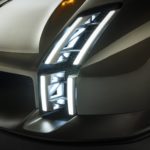 The light signature is an elementary component of the Porsche brand identity. In the Mission X, the designers have reinterpreted the characteristic four-point graphic: The vertical base form of the headlights was inspired by historic racing cars such as the Porsche 906 and 908 and is drawn well down towards the road. A high-tech support structure frames the LED light modules and presents the exposed, narrow elements of the daytime driving lights and direction indicators. When activated, the light opens up like an eye blinking open. The headlights make a confident statement when fully illuminated.