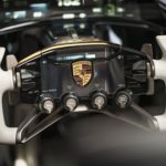 On top of the steering column, a small display window offers a view of the airbag module. As in a racing car, the material used in the steering column has been optimised for weight. The 7.8-inch central display faces the driver. Prominent aluminium controls are positioned to its right. Here again, designers have performance-oriented driving in mind: the climate controls can even be operated with racing gloves on. In classic Porsche fashion, the ‘Le Mans’ starter button is located to the left of the steering wheel and features an elegant, authentic metal design. Here, the designers were inspired by the elegant metallic detailing of historic cameras.
