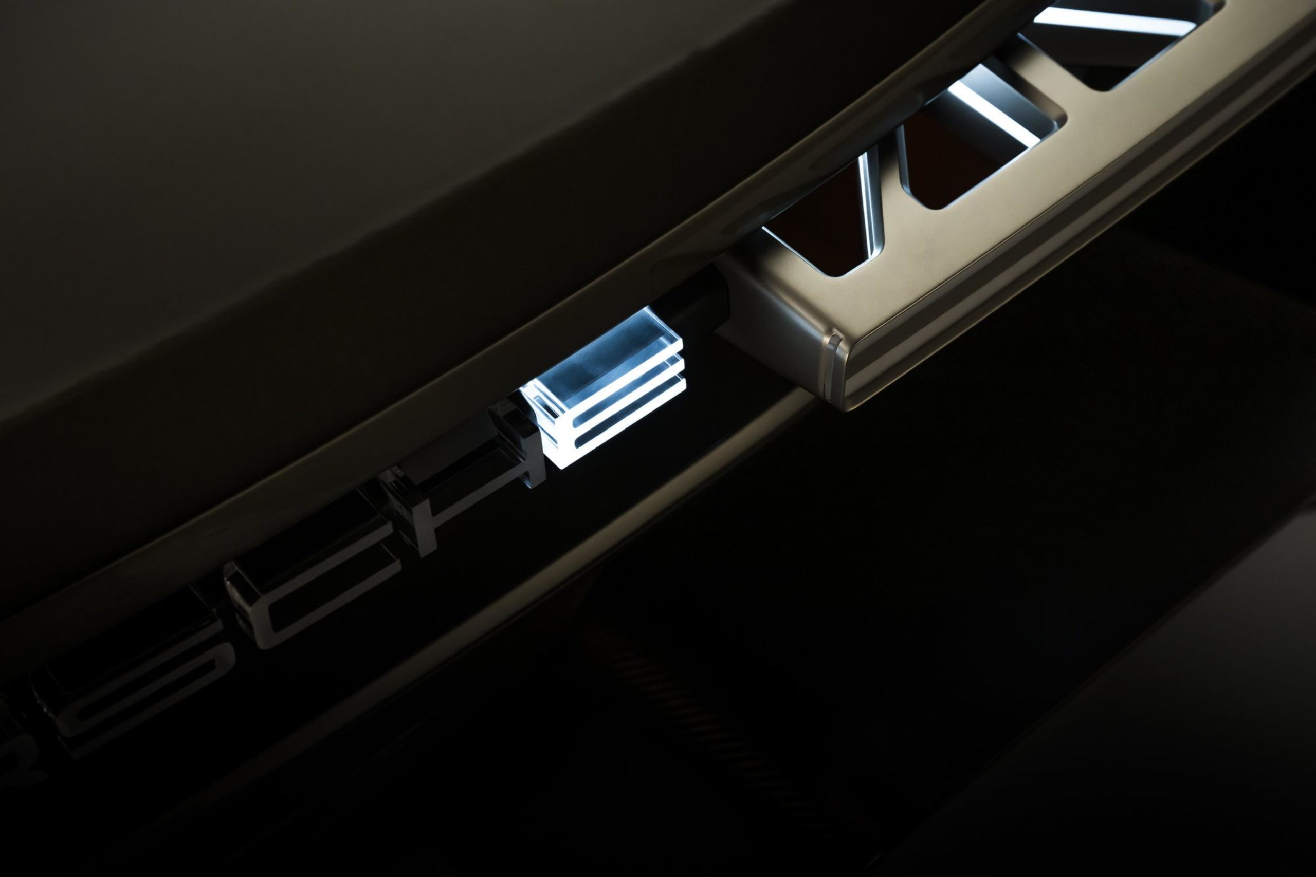 A full-length light unit that seems to float in the air characterises the rear of the Mission X. A transparent, illuminated Porsche logo is a standout feature. The sculpted rear light emerges, as if suspended in mid-air, from a modern support structure and extends across the entire width of the vehicle in four segments. While charging, the ‘E’ in the Porsche logo pulsates, adding a sense of mystery. In a similar fashion, there is also a blinking light in the support structure of the rear light and headlight. Even in such details, the Mission X provides impetus for the further development of future vehicles.