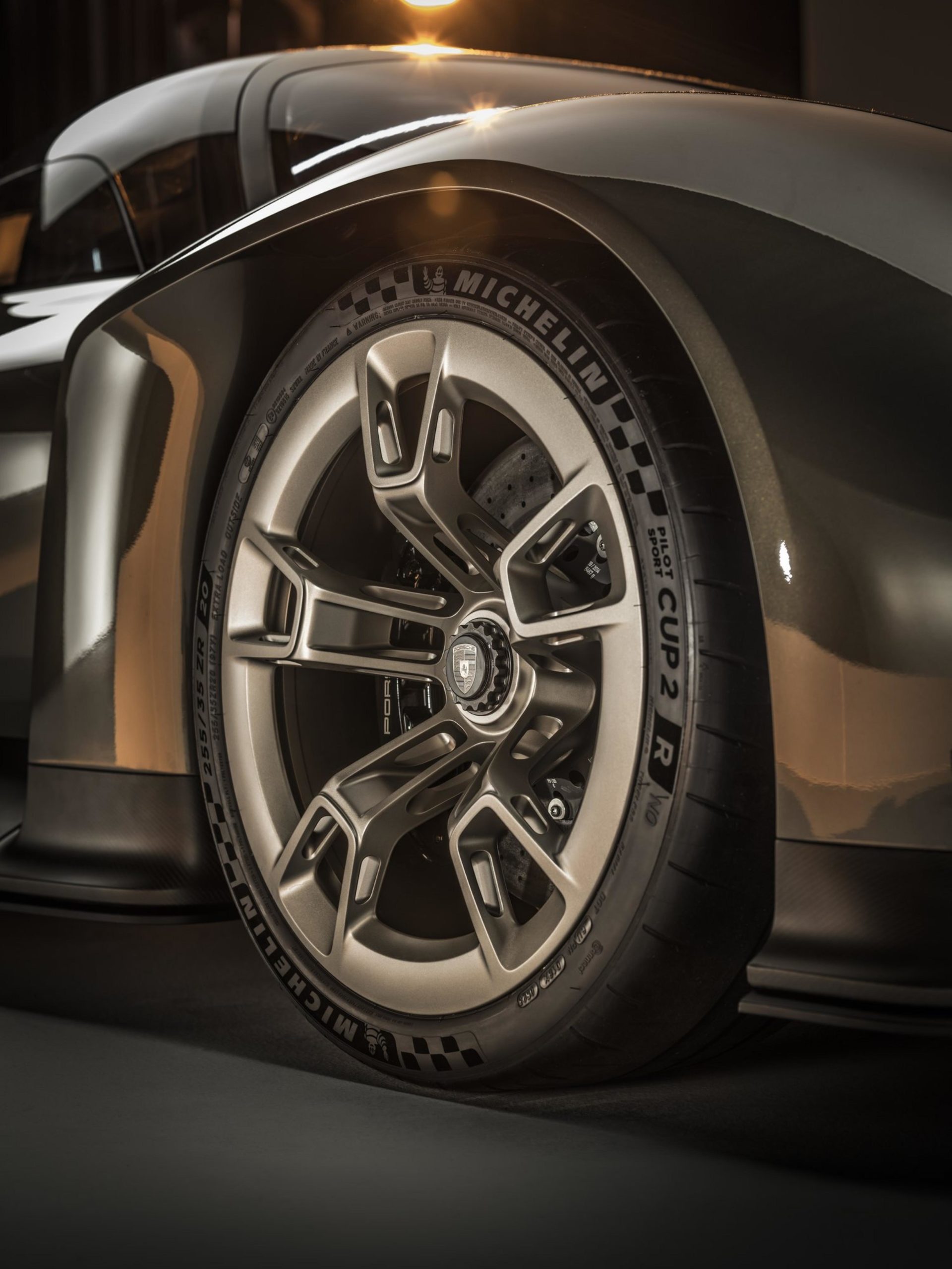The area immediately behind the front wheels is exposed in classic racing car fashion, which allows better ventilation of the wheel arches. While the exterior has the classic Porsche combination of highly dynamic yet visually calm surfaces without decorative styling elements, the wheels of the concept study are elaborately detailed in line with their technical requirements: at the front, they are only lightly clad to allow the airflow necessary to cool the brakes. The wheels at the rear, meanwhile, are fitted with almost transparent aeroblades, which are designed like turbines for better cooling of the brakes. They are reminiscent of the legendary ‘turbine blade’ wheels of the Group A rally cars from the end of the 1980s. The alloy wheels (20 inches at the front, and 21 inches in diameter at the rear) feature a deep-dished design. The bronze-gold double spokes are relief milled, and as such combine lightweight construction and stability.