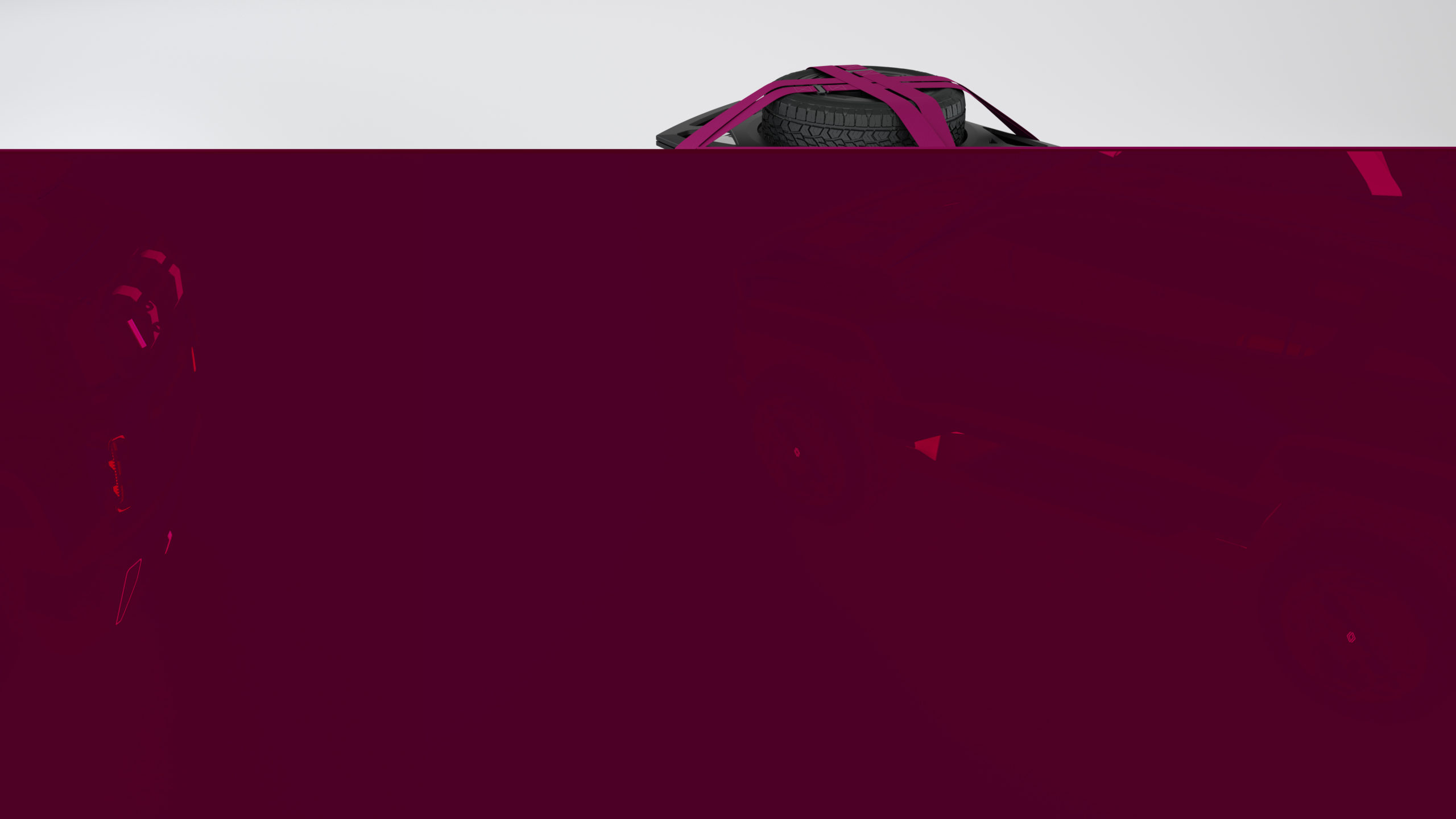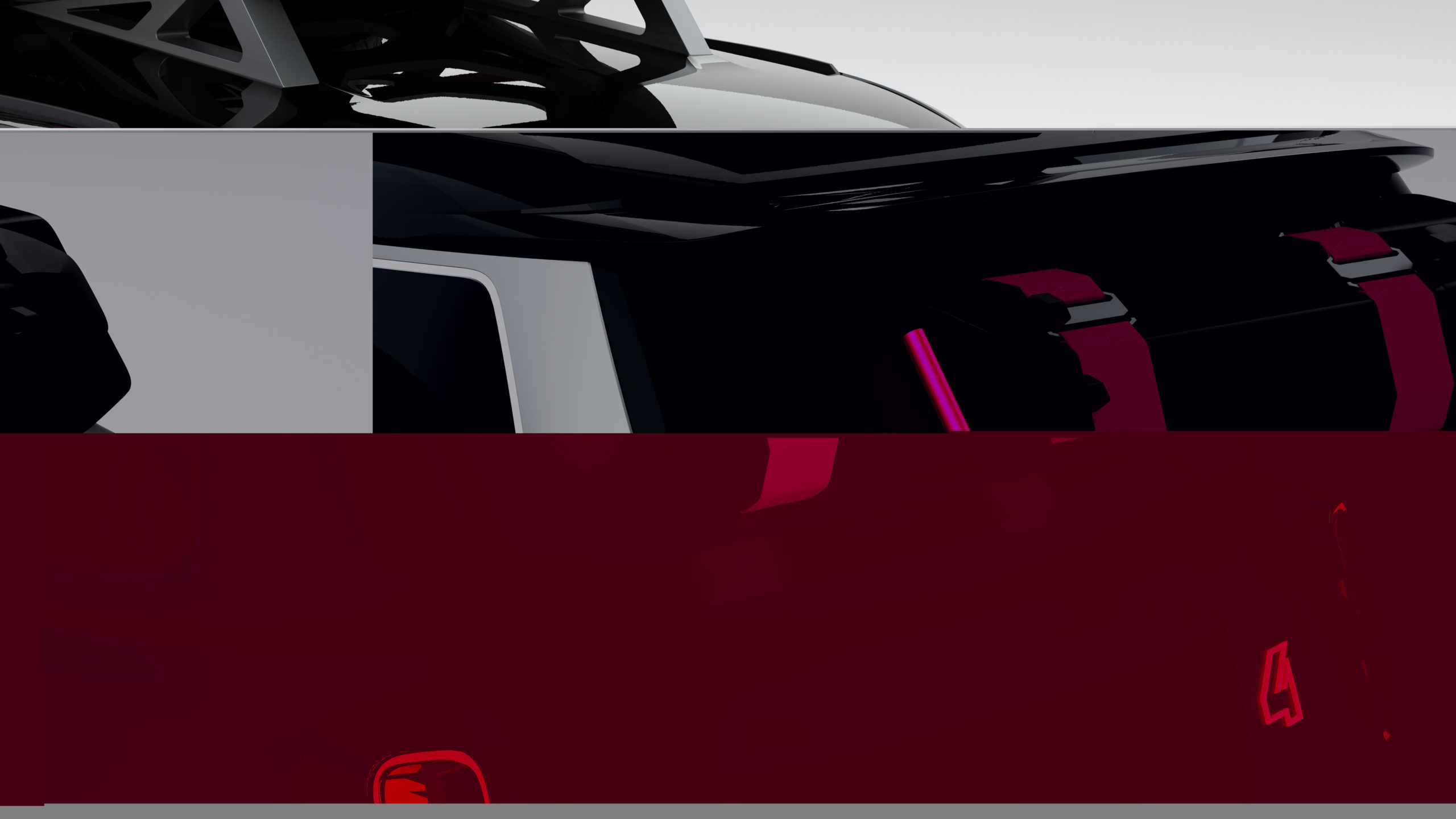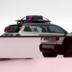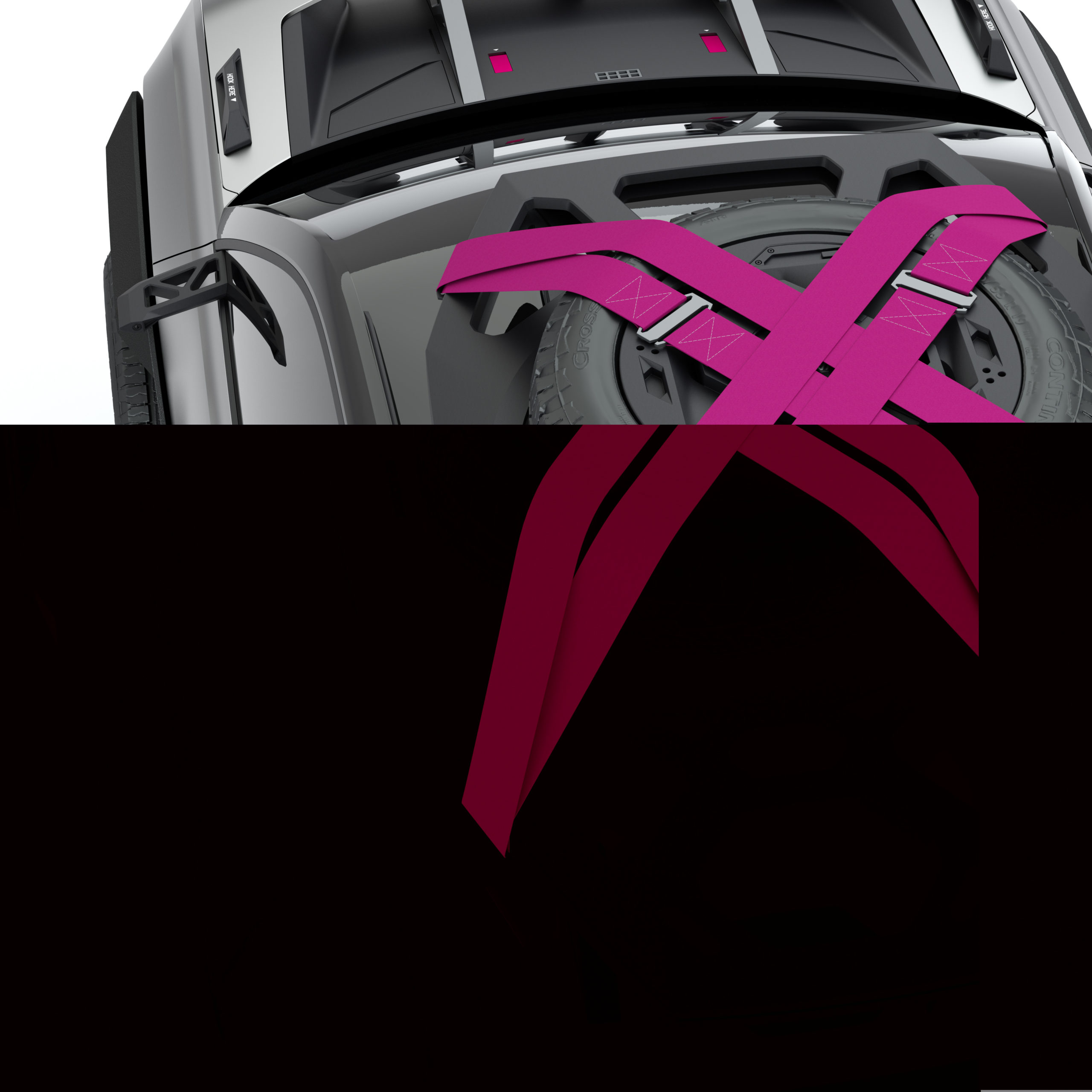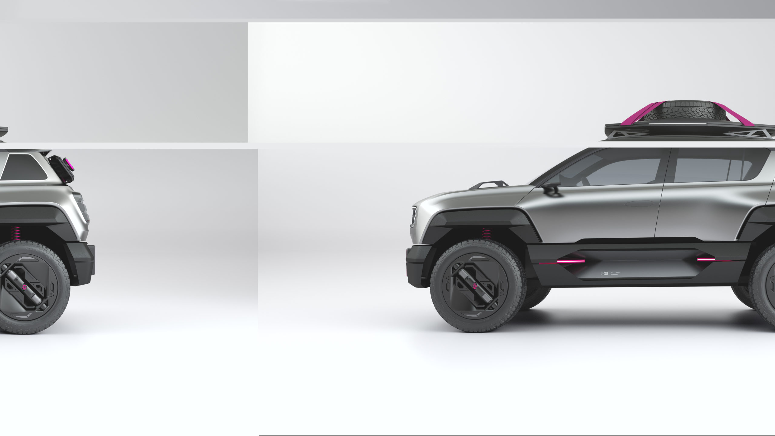 The low section on 4EVER Trophy, painted Gun Metal Silver, has been designed for the great outdoors. An open invitation to explore new horizons, this show car exudes a clearly adventurous spirit. It has a certain flair to its look with the silver coat, and magenta highlights on the roof straps, suspension springs and wheel emblems.
