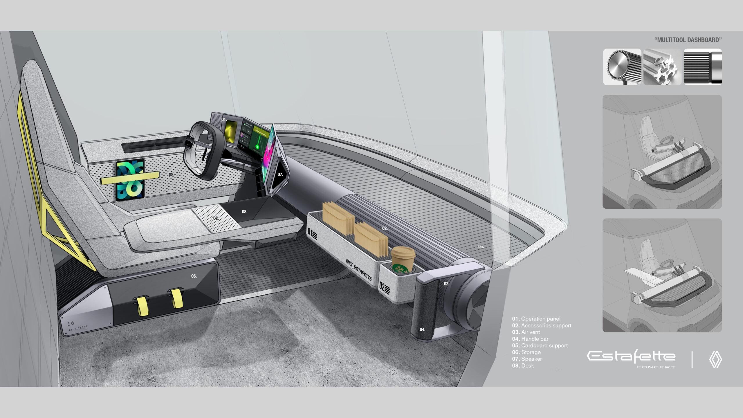 Estafette Concept is designed for cities. It is a compact yet spacious all-electric van combining Kangoo L2’s length, Clio’s agility and Trafic L1H2’s load capacity.