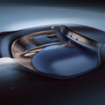 A theatrical cantilevered plinth-like armrest between the two seats makes a bold signature statement with its uninterrupted, elliptical profile. At the touch of a button, the plinth glides backwards and forwards, allowing effortless access to the rotary information and entertainment system controller when required, then hiding it from view thereafter. Recalling the interior’s cosseting treatment, the plinth itself is embraced by inner seat bolsters finished in soft, supple leather.
