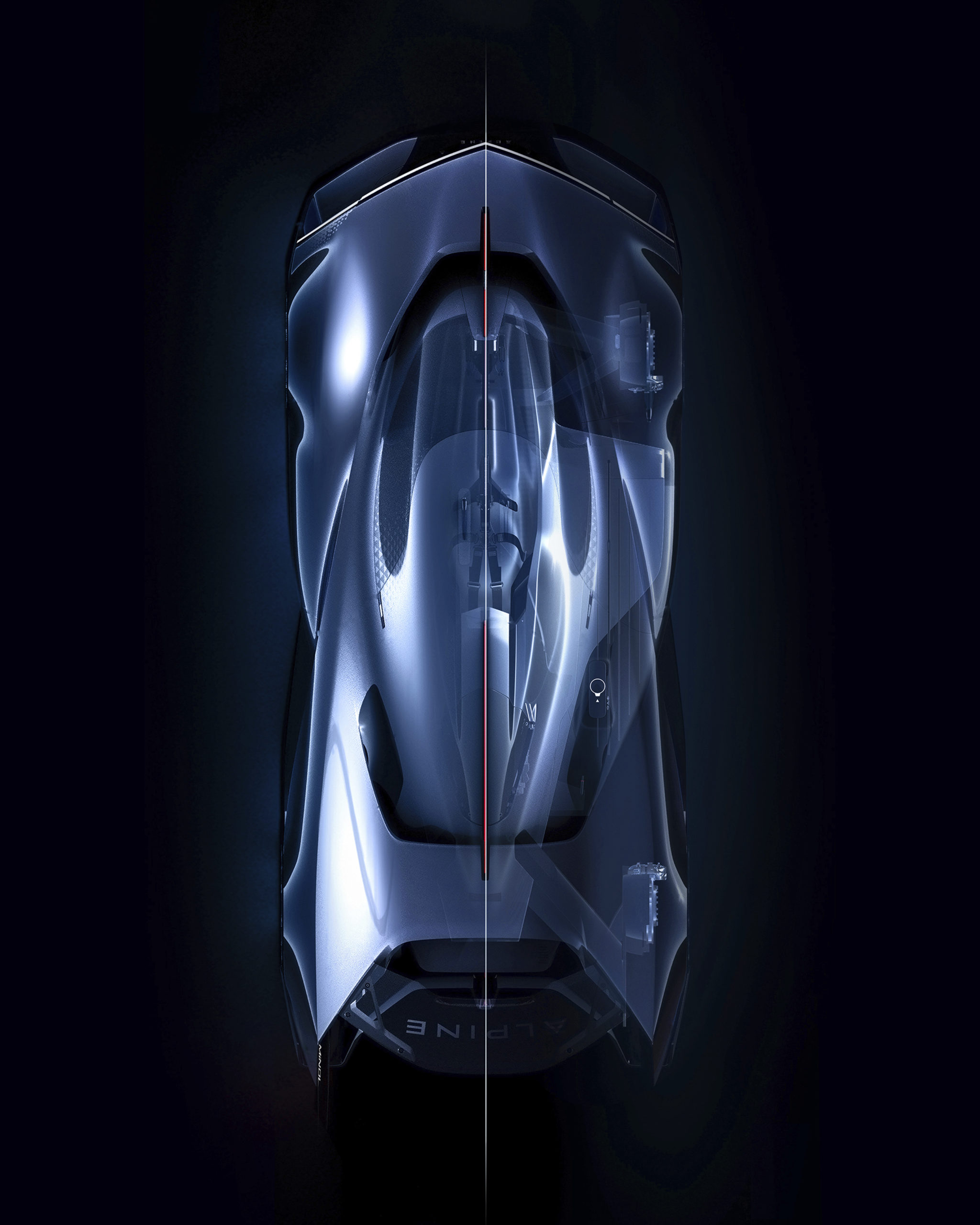 This concept car’s interior and exterior meld. The bodyshell is light and seems to float, enveloping the driver who fuses with their material surroundings. The driver’s silhouette leaves a mark in the cockpit, a bit like someone who falls back into the slow to leave their print. The two “pontoon” waterdrop-shaped tanks on either side of the cockpit add the feeling of being at one with the machinery and at the same time optimise driving comfort. The car becomes a source of pleasure and a vessel for physical engagement. The vehicle triggers emotions and bewitches the driver in ways they will never forget. This driving experience will be developed inside future Alpine models.
