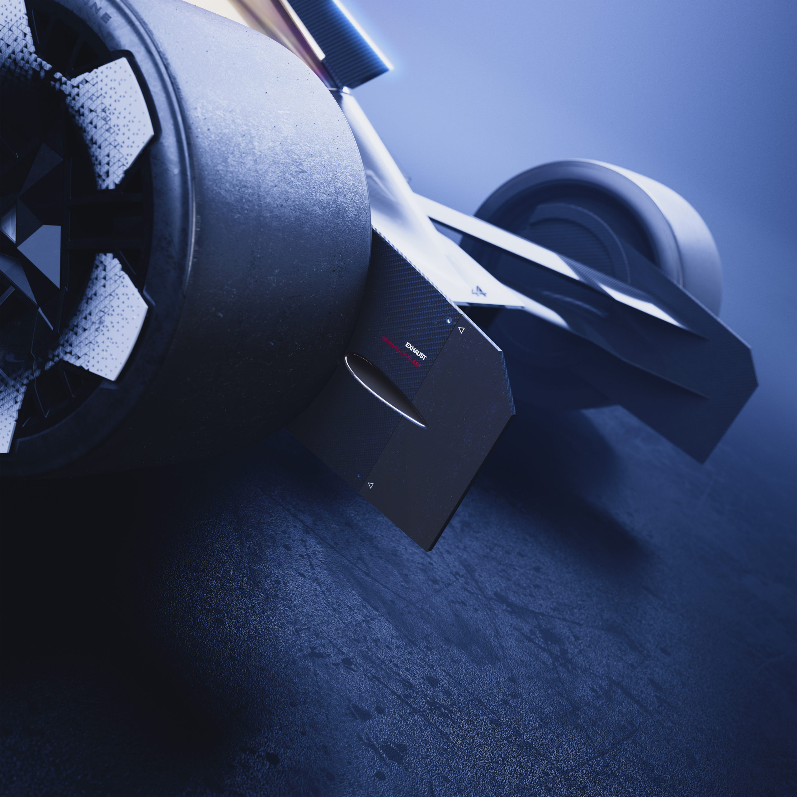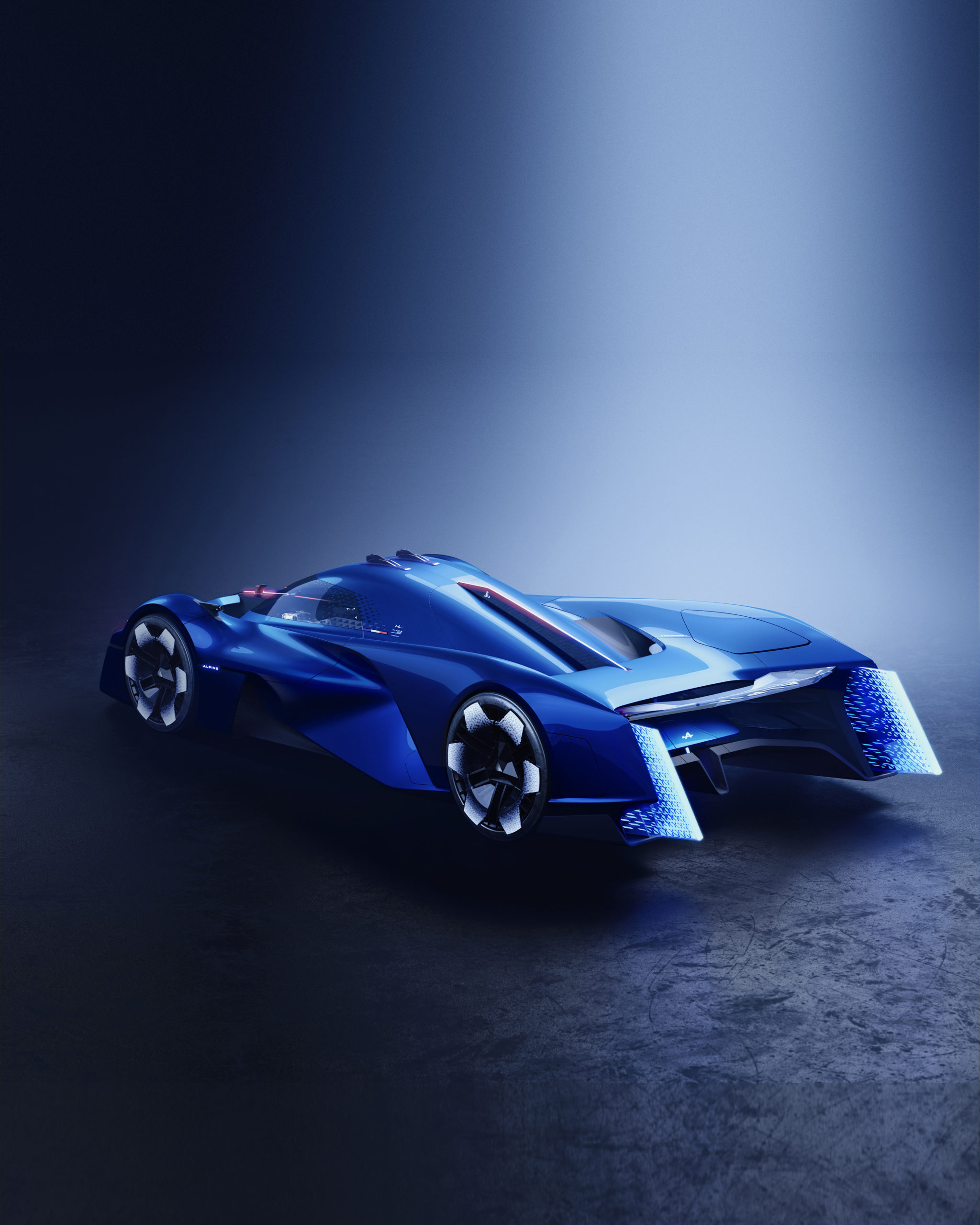 Alpenglow’s signature lights have evolved and adopted a new look. They match with the ones on Alpine cars today, stand out on the strength of their up-to-the-minute style and might, and at the same time remain true to the brand’s identity. They are ushering in a new chapter in Alpine’s history, where passion for speed and performance are more alive than ever. The light stream starts at the front, where it is red, symbolising a comet entering the atmosphere, and works its way back, where it turns various shades of blue pointing to its hydrogen internal-combustion engine, which releases practically nothing but steam. Also at the front, triangles of light form a sprinkling of stars rising from the four headlamps, mirroring Alpine’s emblematic signature. Overall, they create an all-round impression of movement across the car’s body. The blueish lights at the rear point to the use of hydrogen. They are open, look stunning and serve a purpose, venting the steam from the hydrogen’s combustion. In contact with the air, a blue stream emerges from the clean exhaust pipes, giving the Alpenglow concept car a sporty and at the same time magical aura.