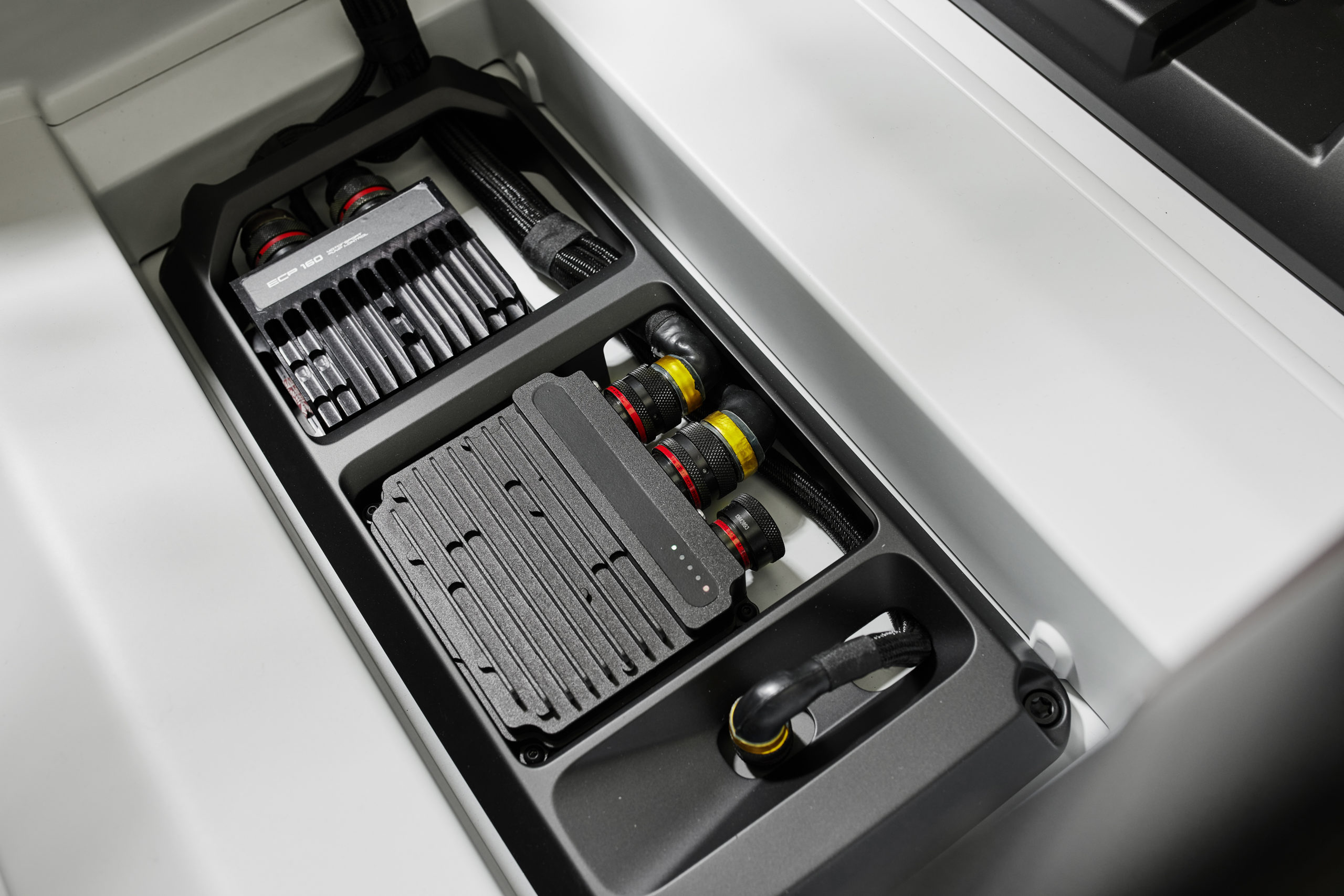 The roof module is reminiscent of the profile of a submarine: among other things, it incorporates a pitot tube to measure speed and an LED display to indicate the operating status of the high-voltage system.