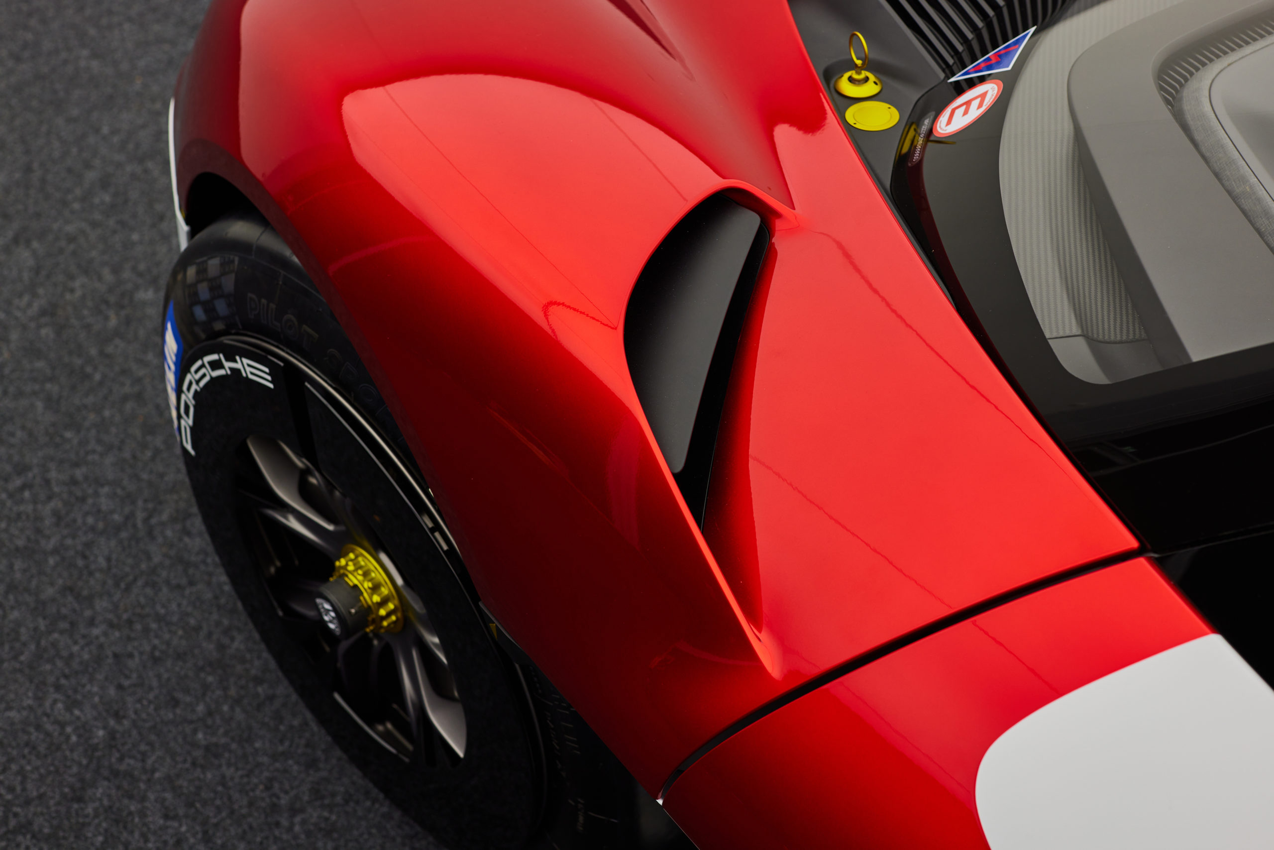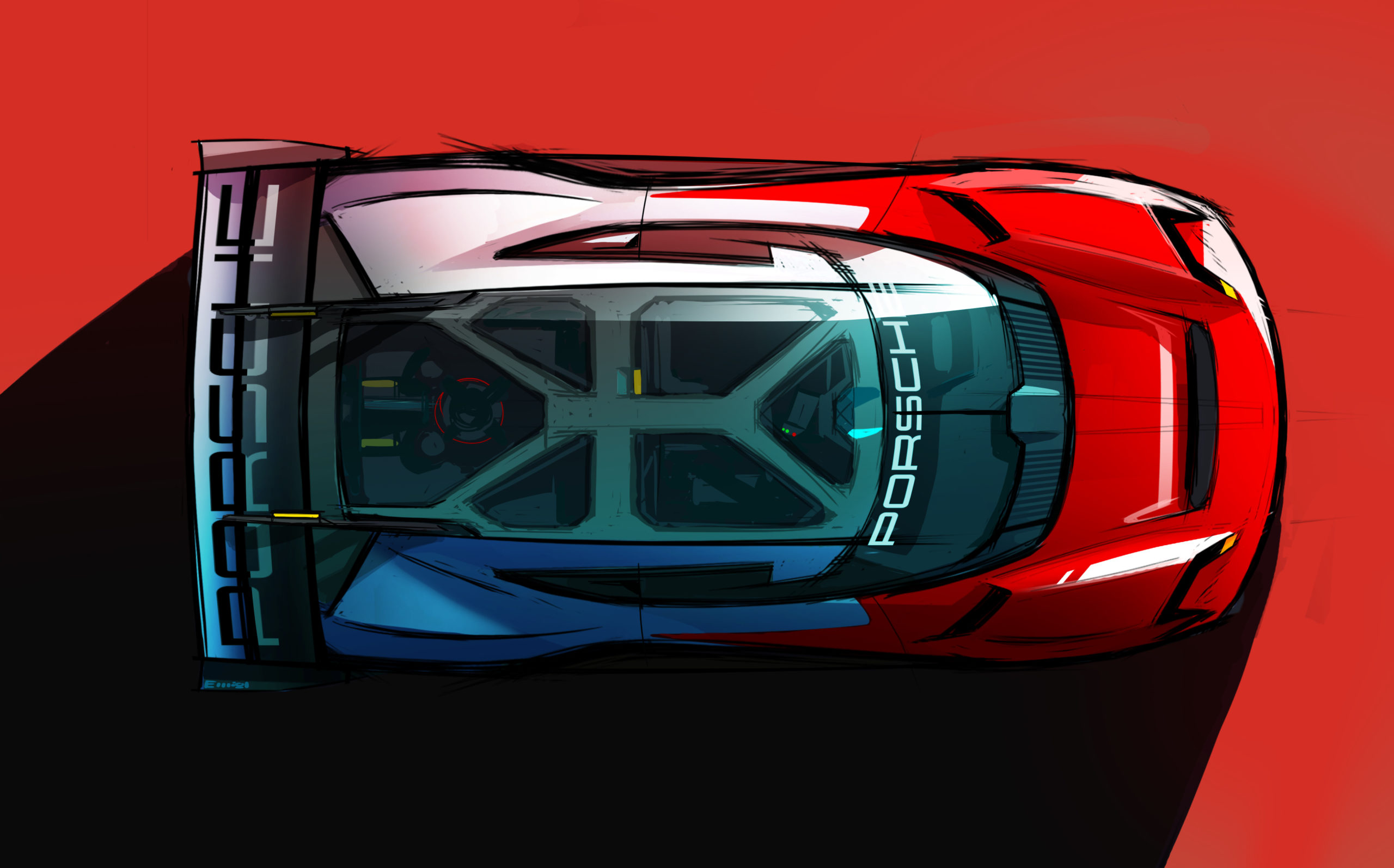 The colour concept is dominated by Porsche’s standard Carrara White Metallic satin finish. By contrast, the front bonnet and front wings are painted in a high-gloss bright metallic red. This new shade extends into the doors, where it ends with a dynamic sweep. The spoilers are in black to provide a sharper contrast.