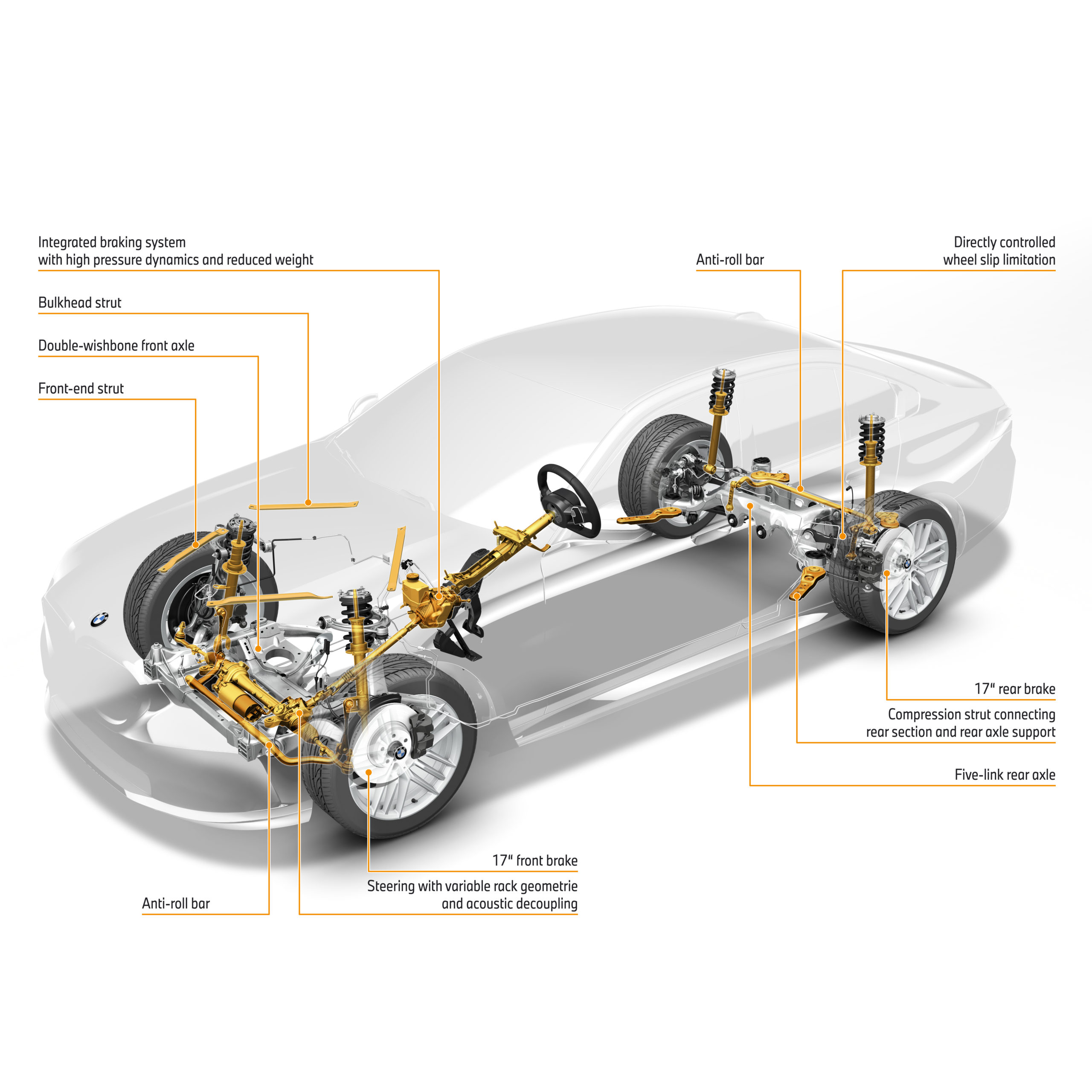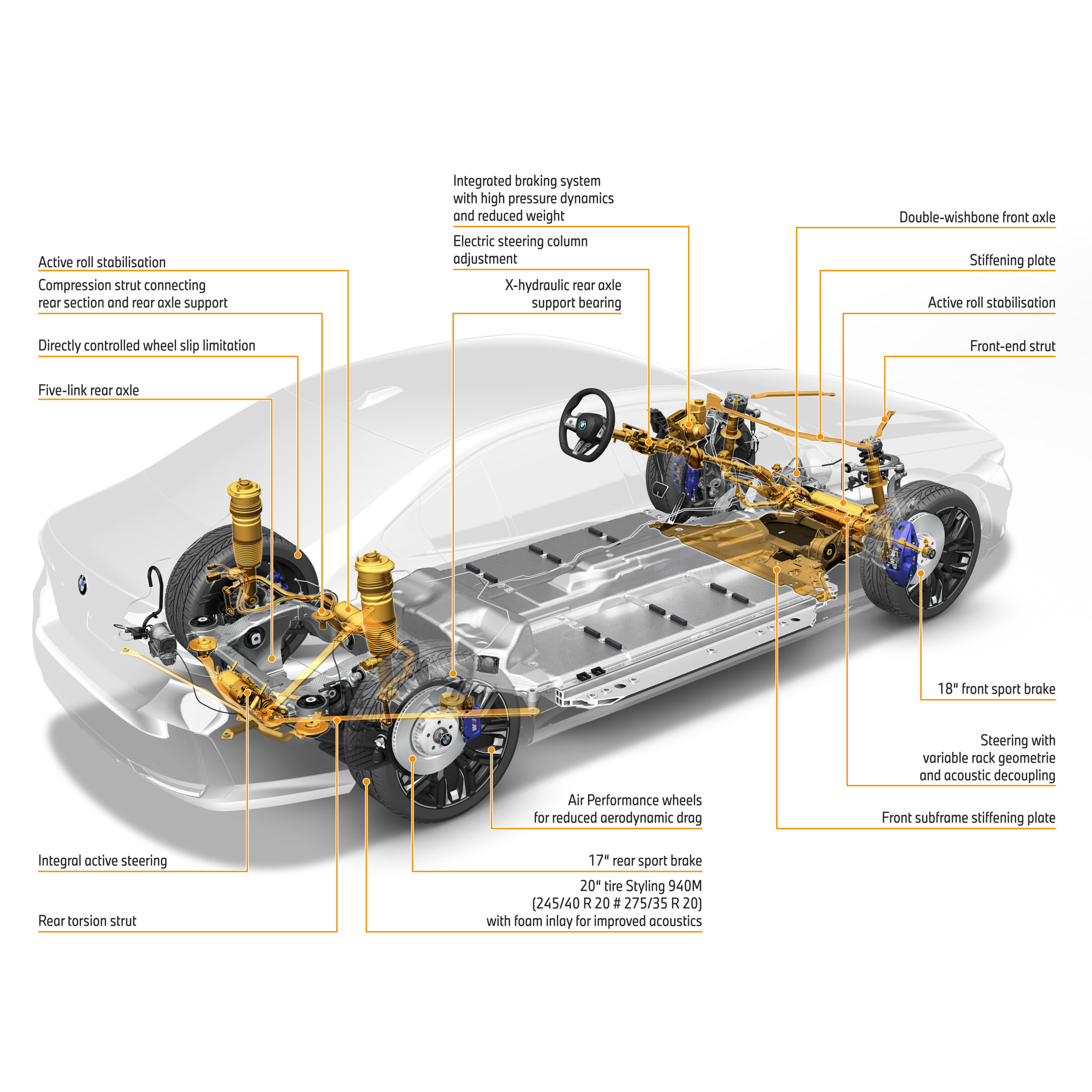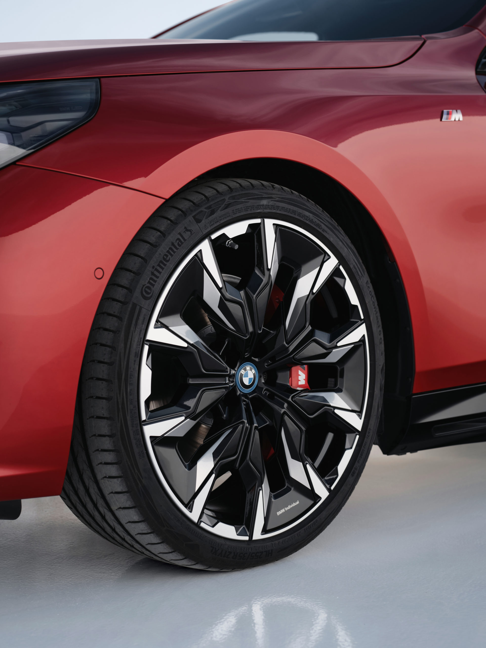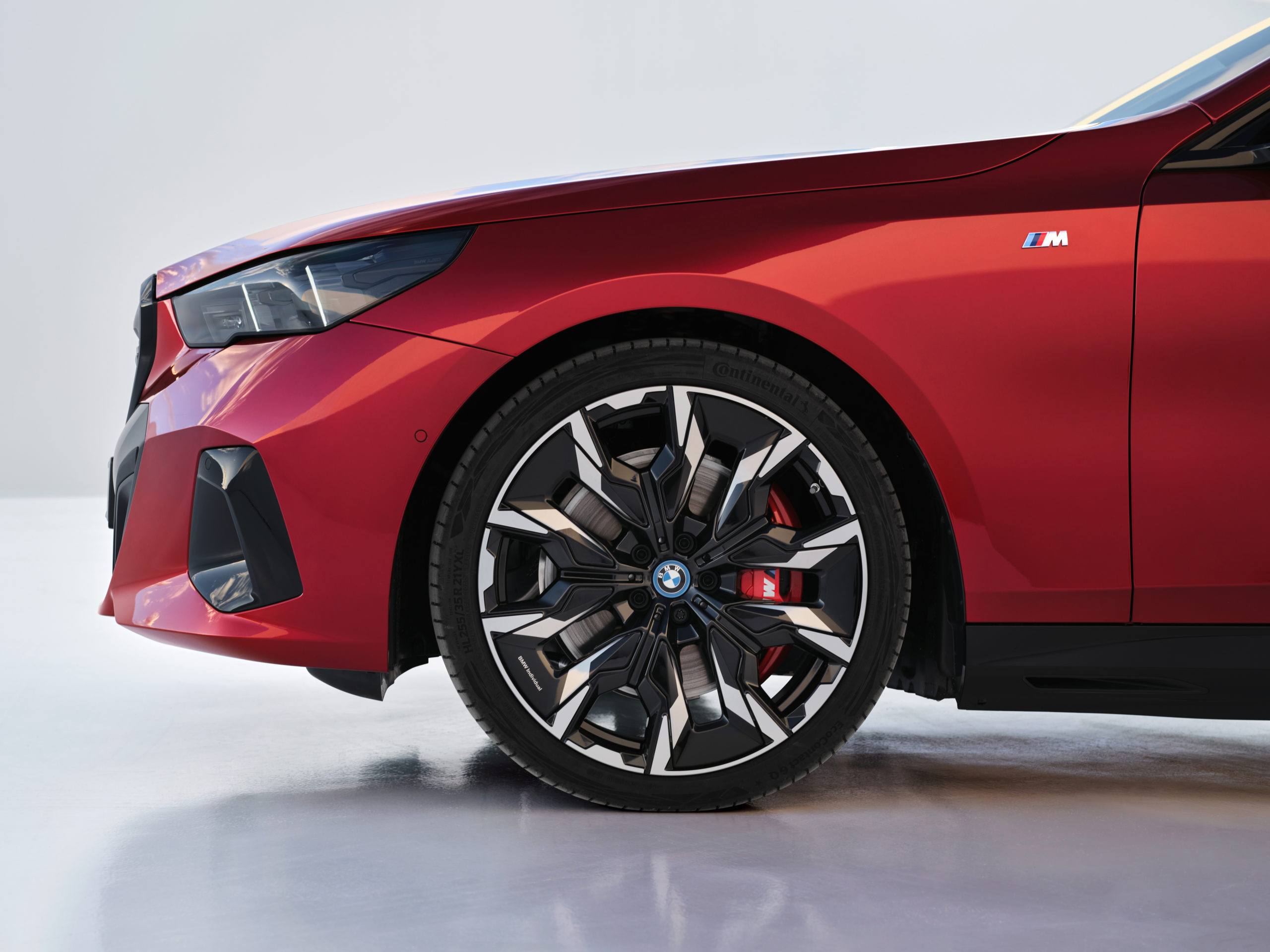 The extensively advanced chassis technology, like the control systems, has been model-specifically adapted to the weight balance associated with the respective drive technology. It includes directly controlled wheel slip limitation, integrated braking system and sport steering with variable steering ratio as standard. An M sport suspension, an M sport brake system and the Adaptive Suspension Professional (standard in the BMW i5 M60 xDrive) with electronically controlled shock absorbers, Integral Active Steering and new vertical dynamics management are available as options. The optional Adaptive M Suspension Professional also includes Active Roll Stabilisation with Active Roll Comfort. Light alloy wheels in 18-inch or 19-inch sizes (BMW i5 and plug-in hybrid models) are standard equipment. Light-alloy wheels up to a size of 21 inches and performance tyres are offered as options.