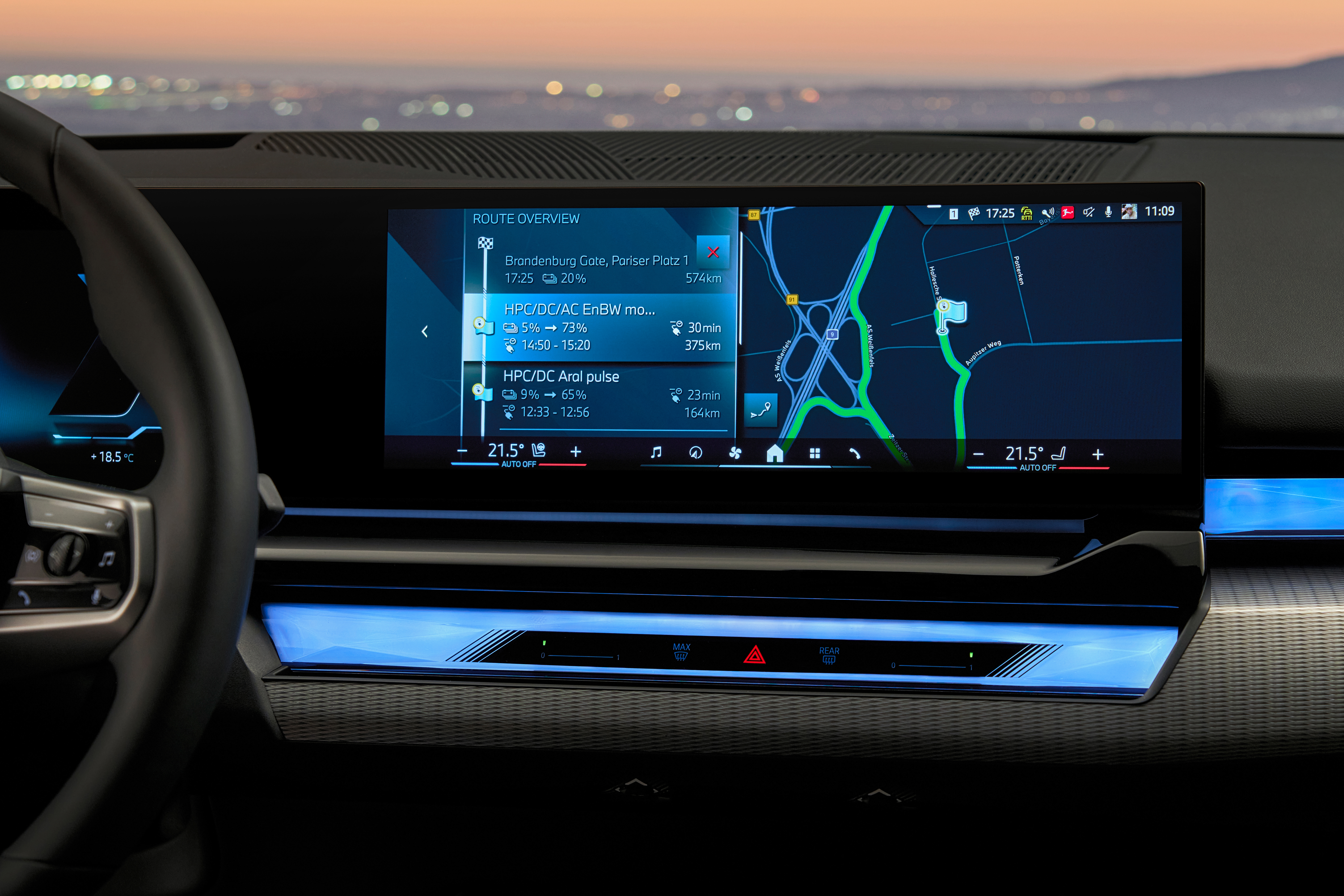 The space-saving high-voltage battery is located in the underbody and provides a usable energy content of 81.2 kWh. In addition to the efficient electric motors, the latest version of adaptive recuperation and an intelligent combination of heat pump technology for heating and cooling the interior, drive and high-voltage battery contribute to the long range. The respective WLTP values are 455 – 516 kilometres (282 – 320 miles) for the BMW i5 M60 xDrive and 497 – 582 kilometres (309 – 361 miles) for the BMW i5 eDrive40. With the new MAX RANGE function, the range can be increased by up to 25 percent if required by limiting power and speed and deactivating comfort functions.