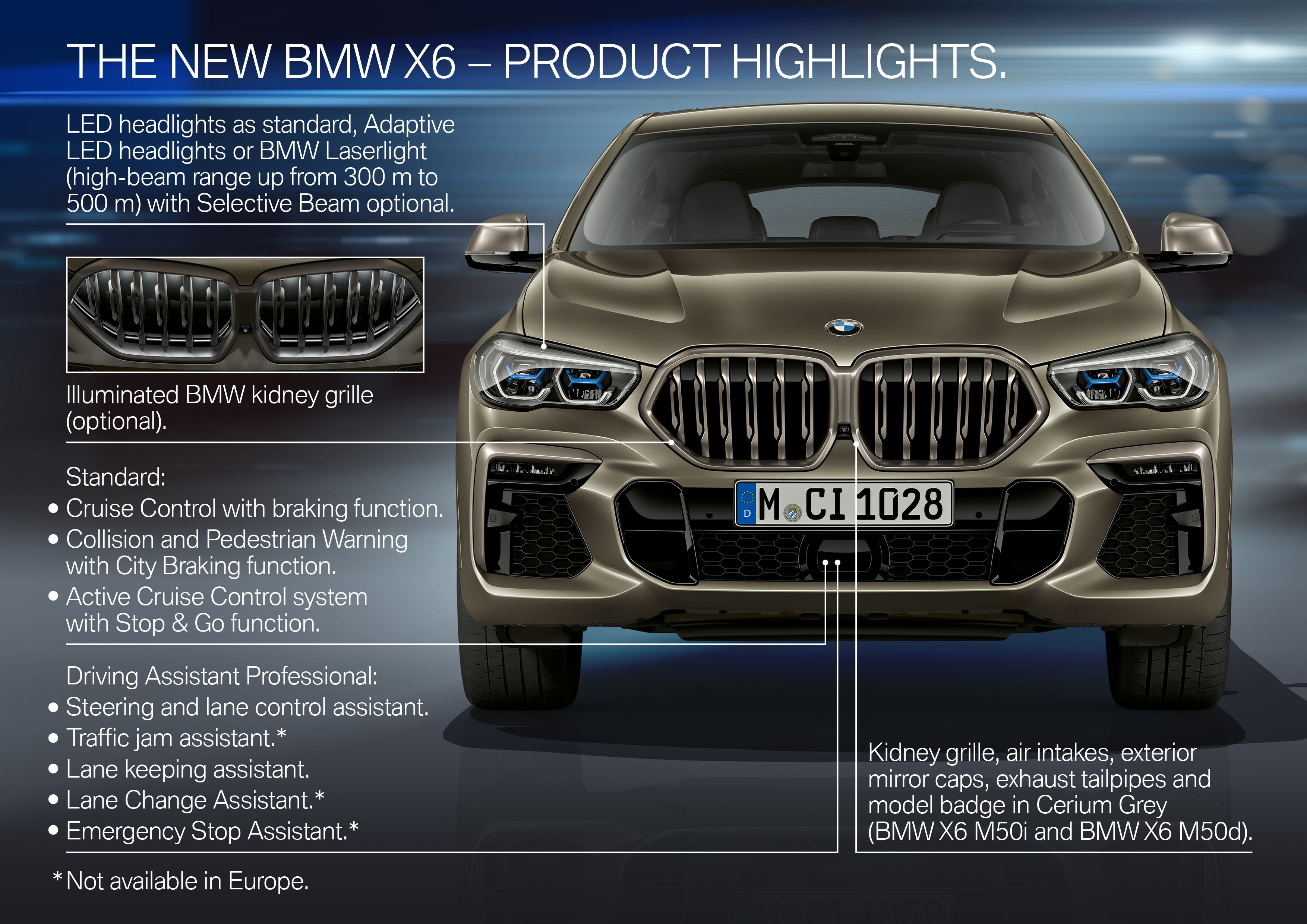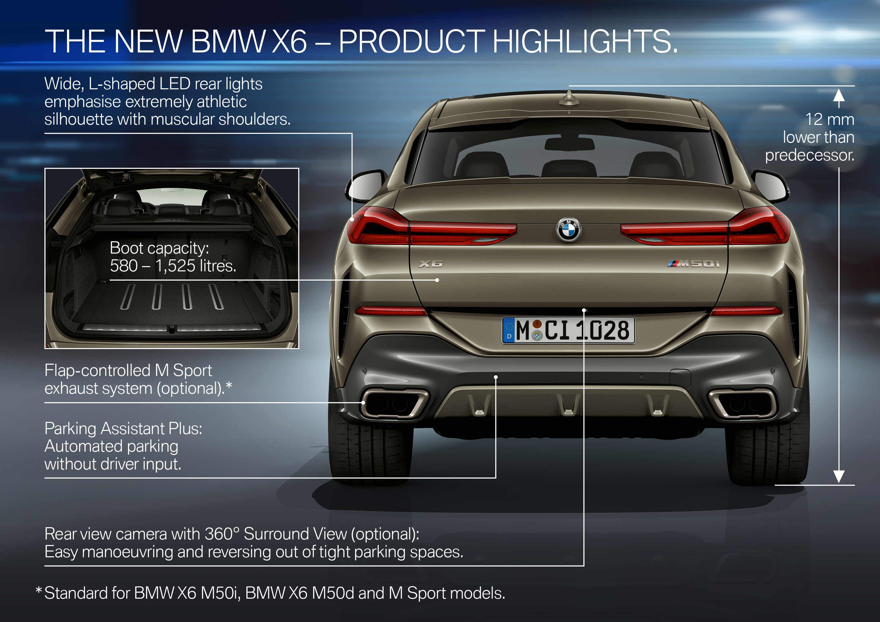 The new BMW X6 blends the agile and versatile driving properties of a Sports Activity Vehicle with the head-turning looks of a coupe. The third-generation X6 employs a clean, exclusive design language to underscore its confident and commanding appearance. And advanced powertrain and chassis technology teams up with a wealth of innovations to deliver a uniquely sporting yet also luxurious driving experience. Like its predecessor, the new BMW X6 will be produced in the US at BMW Group Plant Spartanburg. The market launch will begin in November 2019.