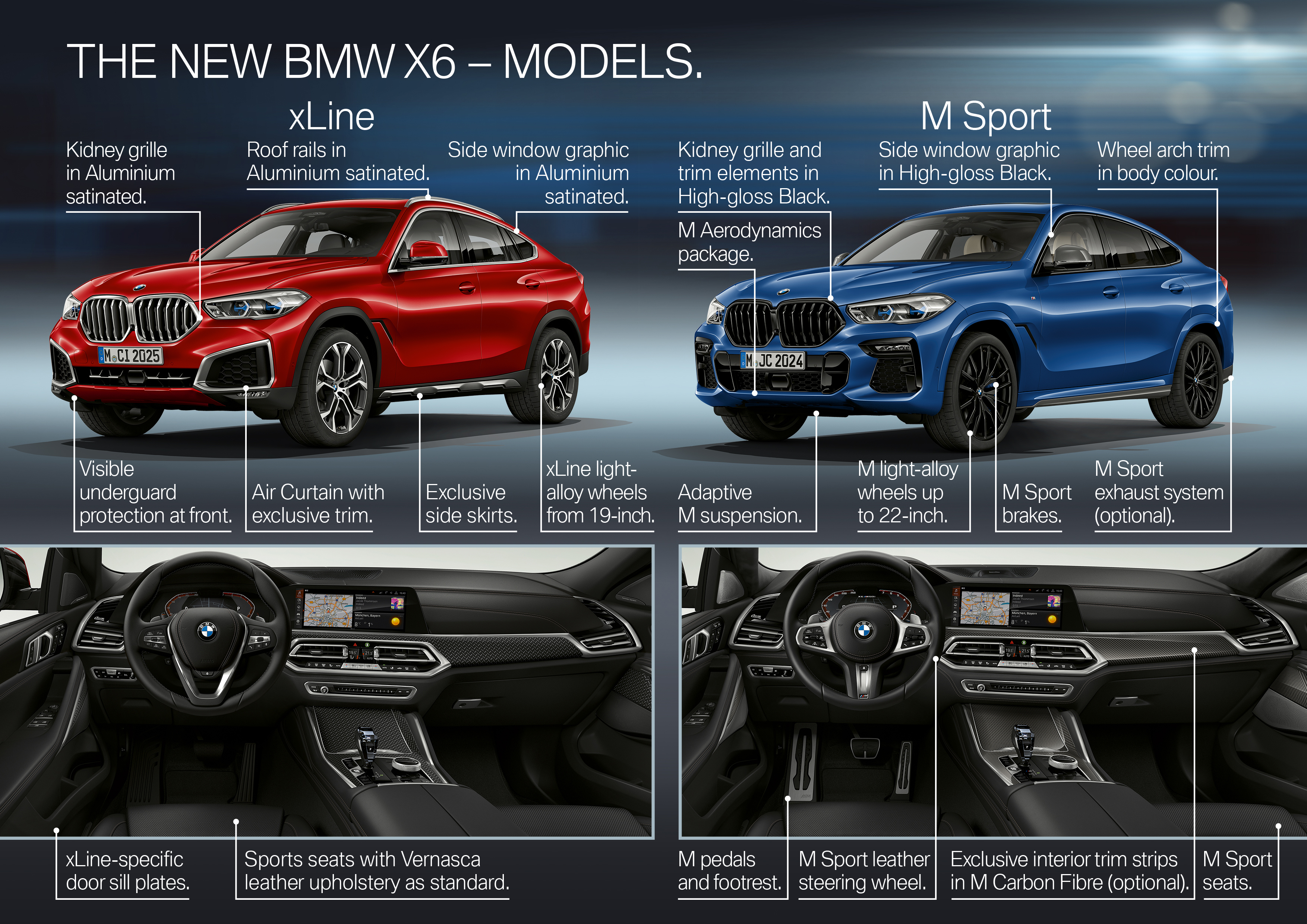 The new BMW X6 is available from launch in xLine and M Sport model variants as an alternative to standard specification. The two equipment lines each have their own distinctive design cues.
