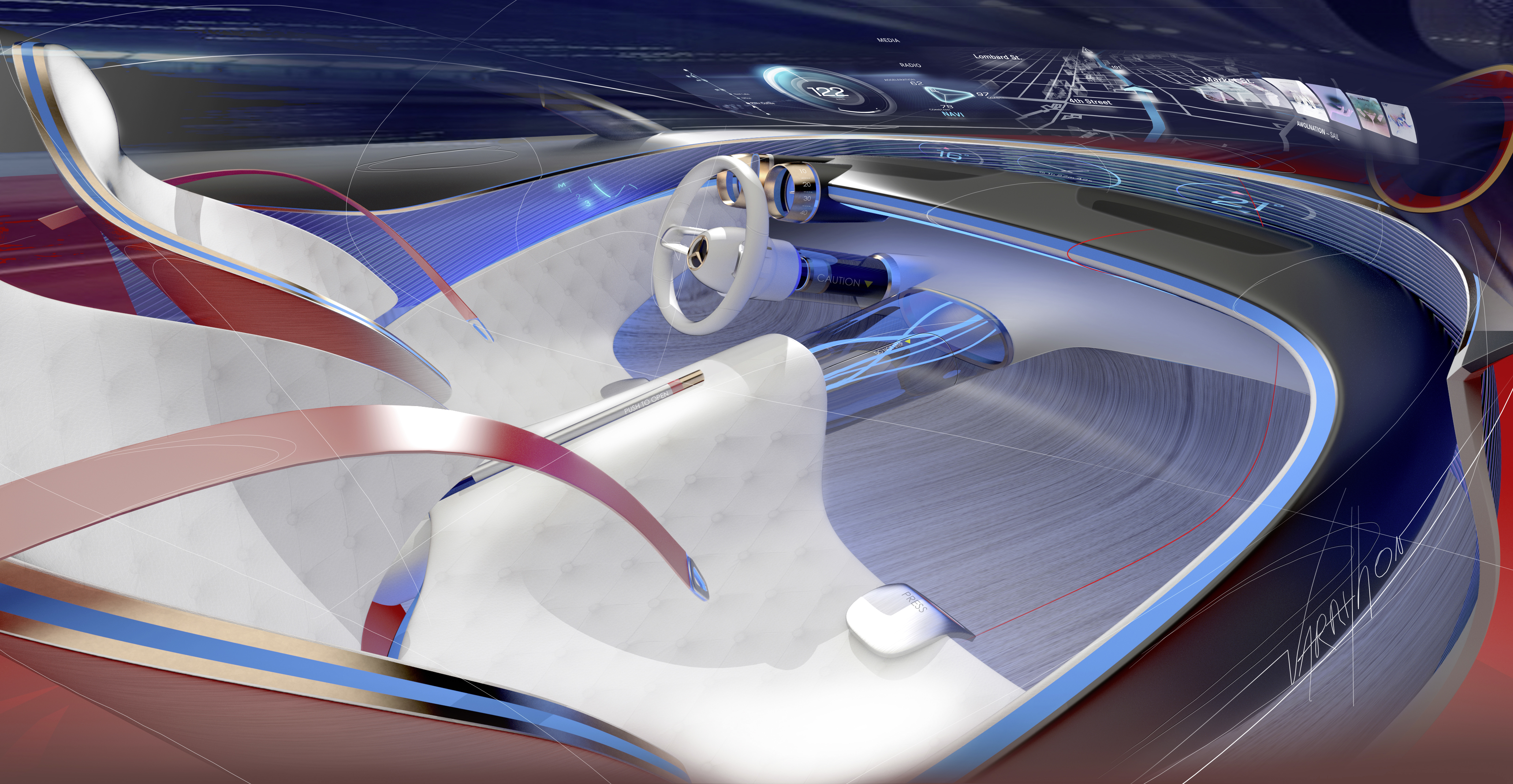 The front windscreen serves as a transparent display: driving-related data and geographical information is shown across its full width, augmenting the outside world with additional information. This information can be controlled and adjusted by the occupants using gestures.