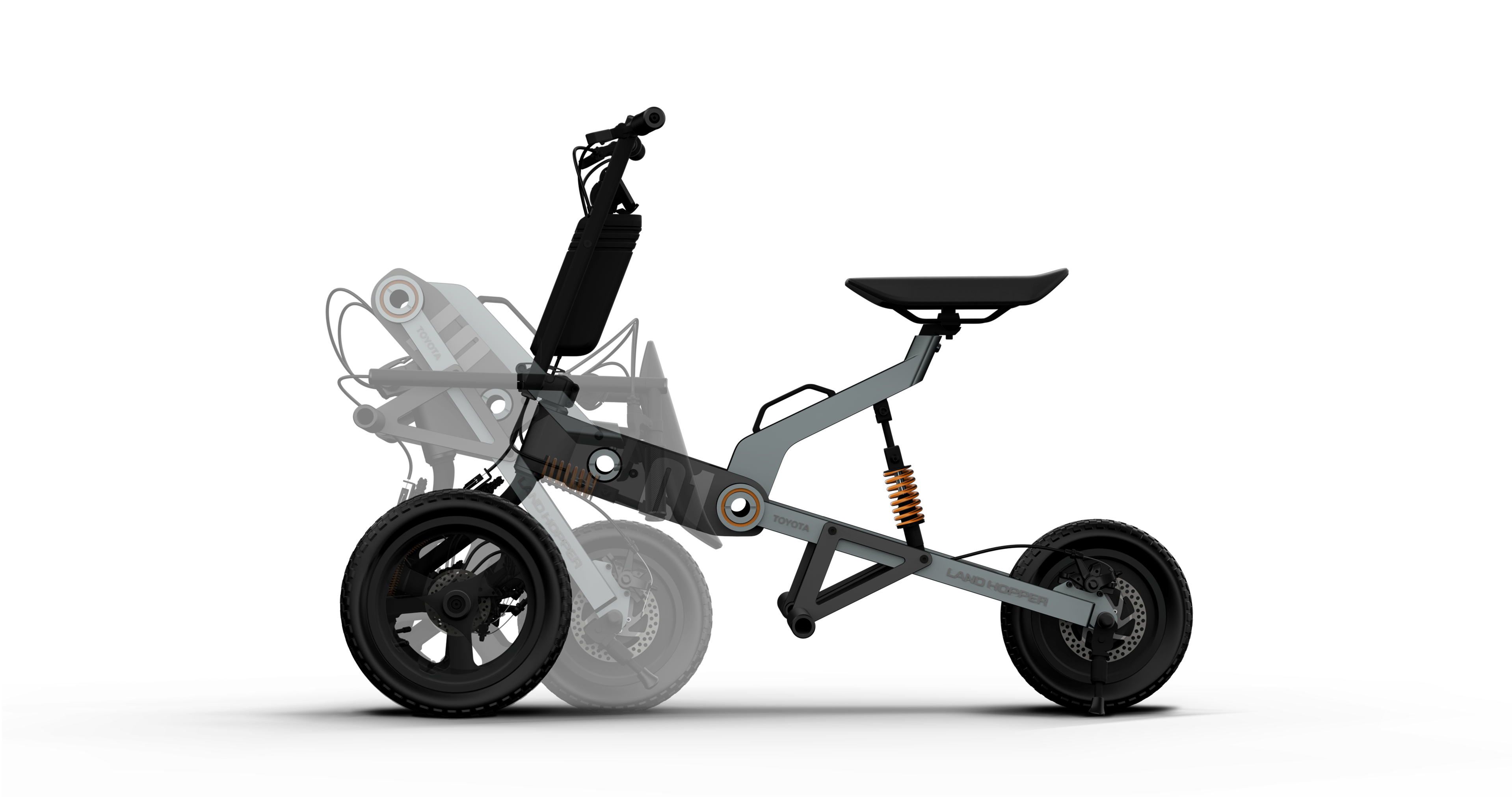 Three-wheeled electric personal mobility concept, with two front wheels opening up new transport possibilities. A foldable design makes for easy storage even with limited car trunk space. When combined with a car, the Land Hopper expands the pleasures of travel, including touring around destinations.