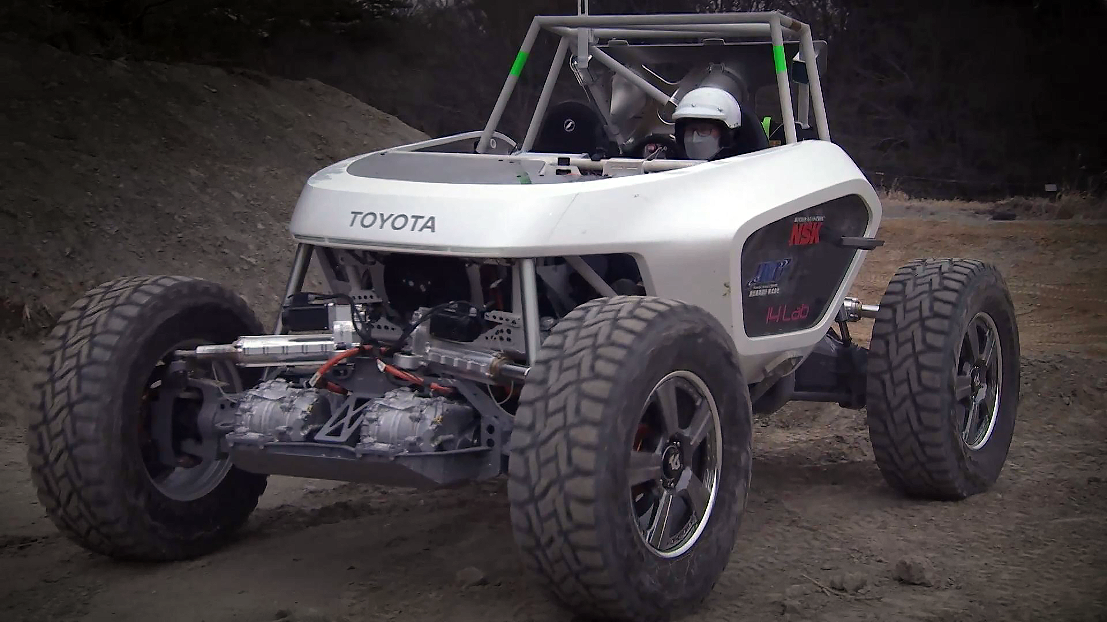 An experimental vehicle for advancing development, particularly of drive system technologies, aimed at creating mobility for use on the moon and in outer space. Each wheel is fitted with its own motor and steering, as part of specifications being developed to provide safe, reliable driving even in rugged and unforgiving extraterrestrial environments.