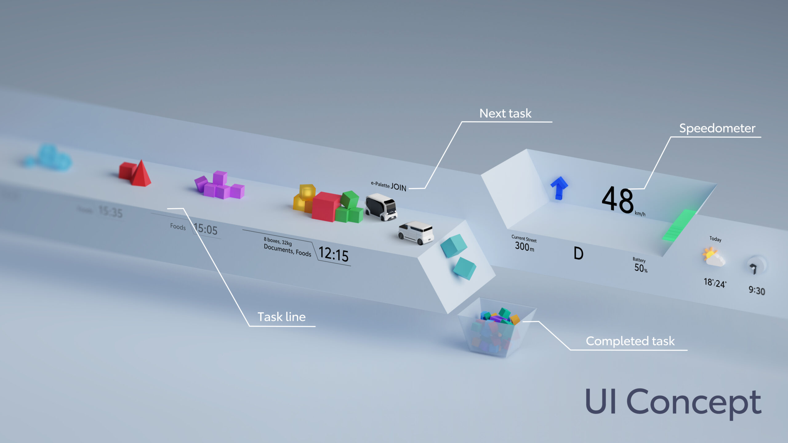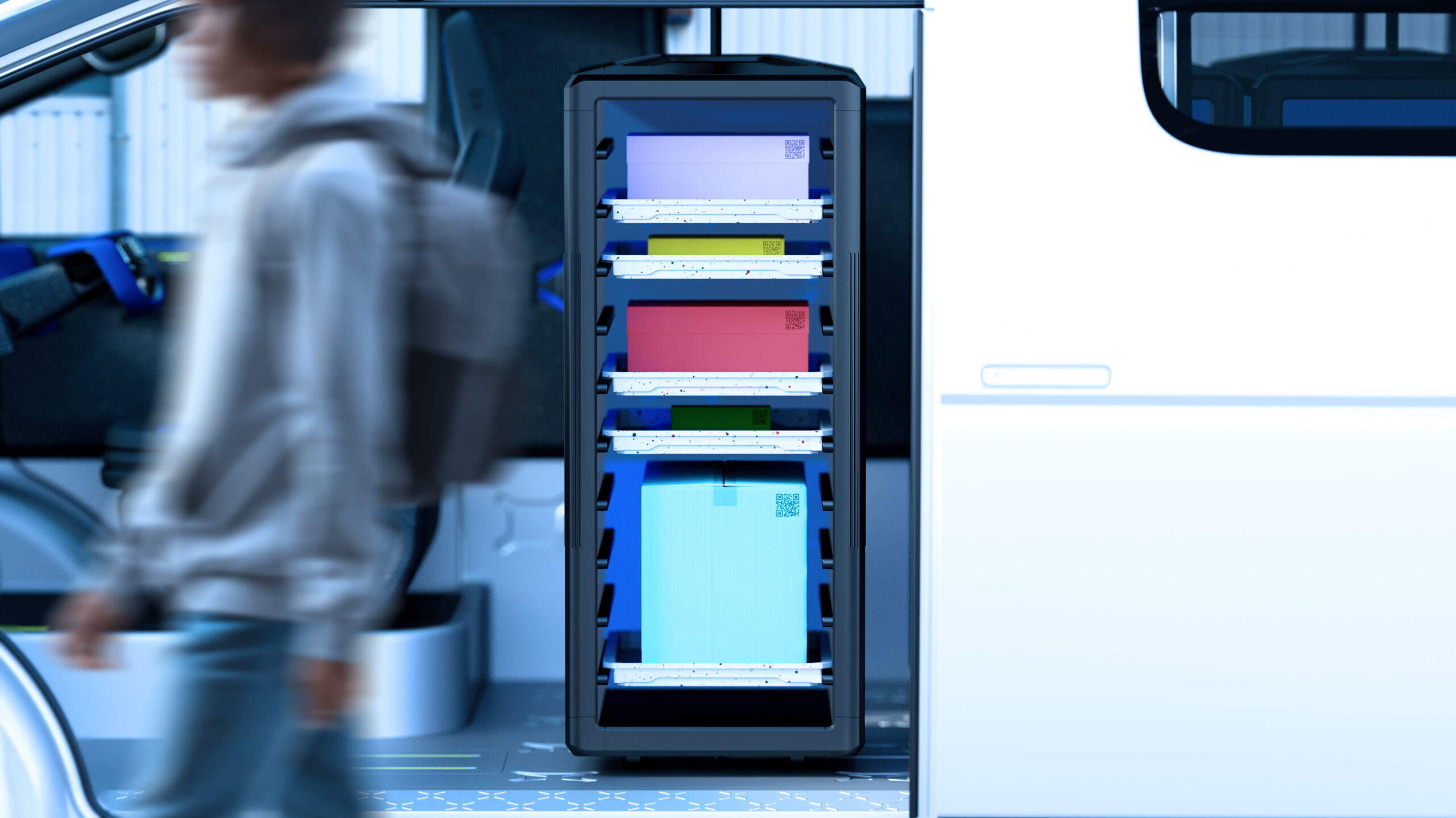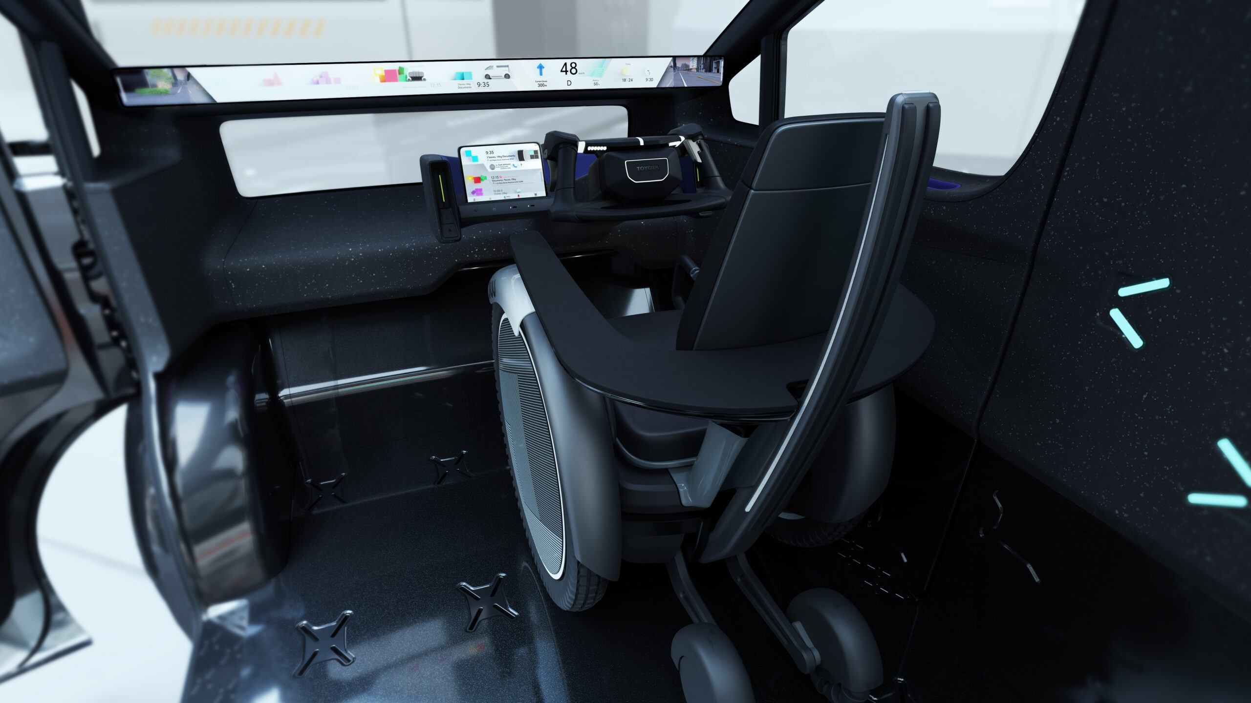 The word kayoibako refers to configurable shipping containers for safely and efficiently transporting parts and products between facilities, sized to eliminate waste and able to meet diverse needs with changeable inserts. Adopting this approach, the KAYOIBAKO is a new compact space concept that represents the future of mobility.