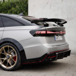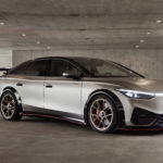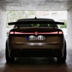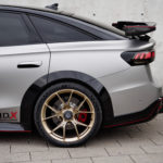 The vehicle sits on 20-inch sports alloy wheels with a central lock and size 265 racing tyres. At the rear, a carbon wing ensures the necessary downforce. Tinted tail light clusters emphasise the sporty appearance of the high-performance electric limousine. In the vehicle interior, occupants sit on carbon bucket seats, which provide optimum support even with a dynamic driving style. Red accents emphasise the sporty characteristics in the interior.