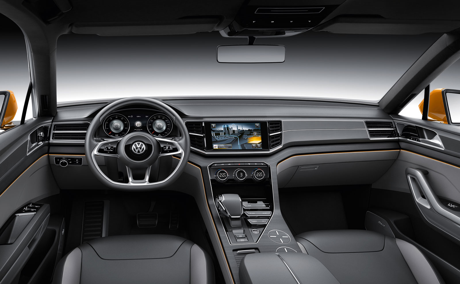 The 22-inch polished aluminum-alloy wheels also feature a new design, with five V-shaped dual spokes that have a matte finish on their inner surfaces. Five trim pieces that are painted in the body color of “CrossOrange Metallic†surround the central VW badge, presenting yet another design element.