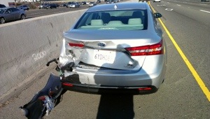 The Jeep and I, both in the Number 1 lane, moved to safety on the side of the car pool lane, and contacted 911. I took the attached photos while waiting for CHP. As you can see, substantial damage, enough to have the car towed away.