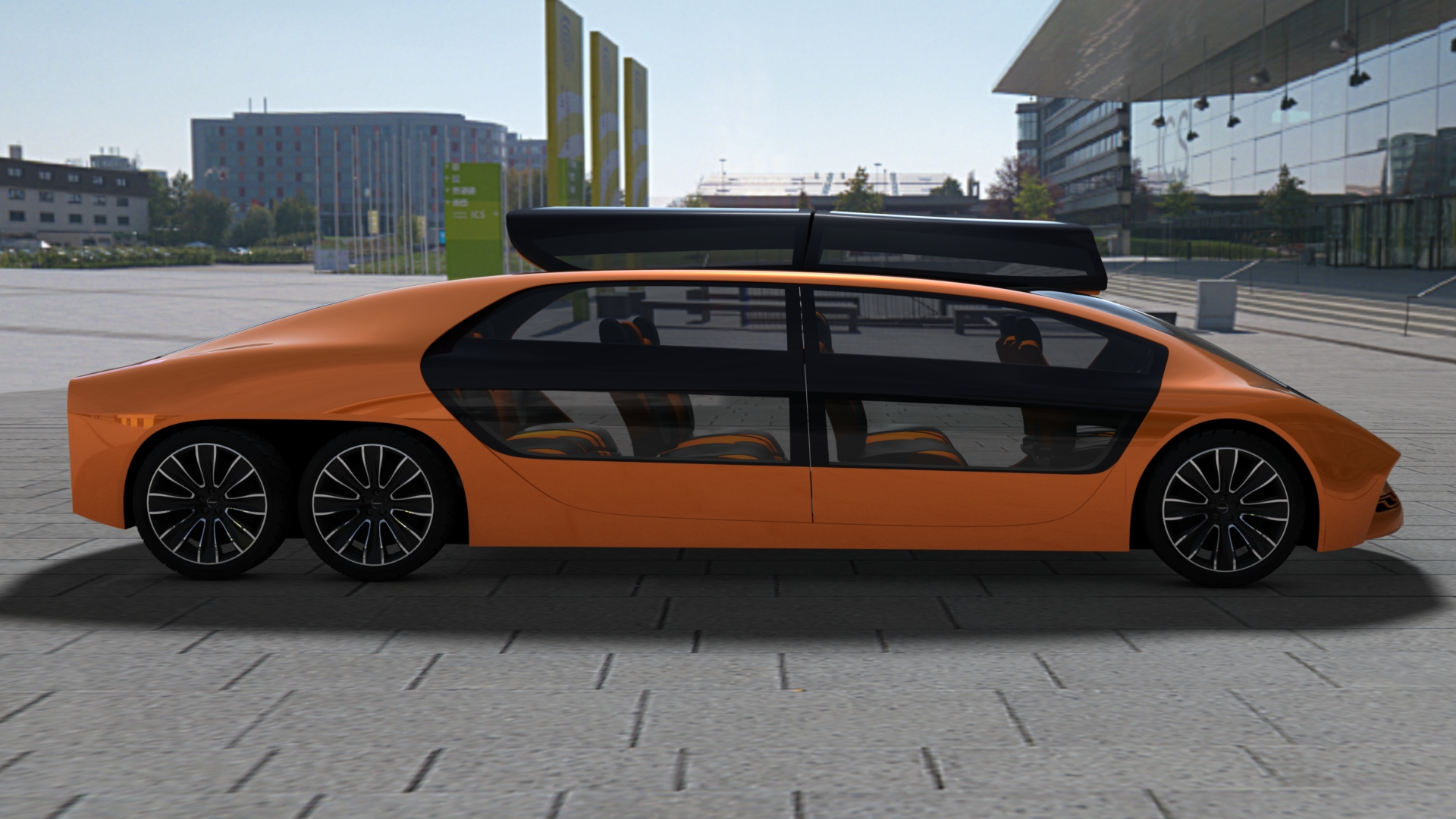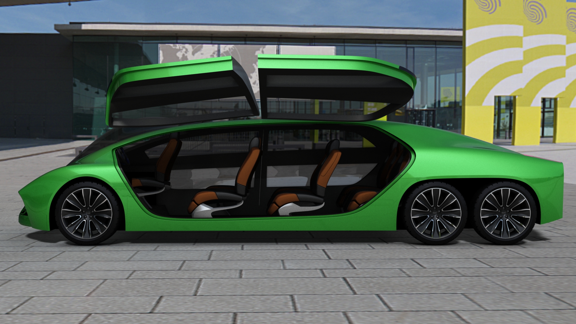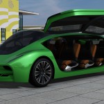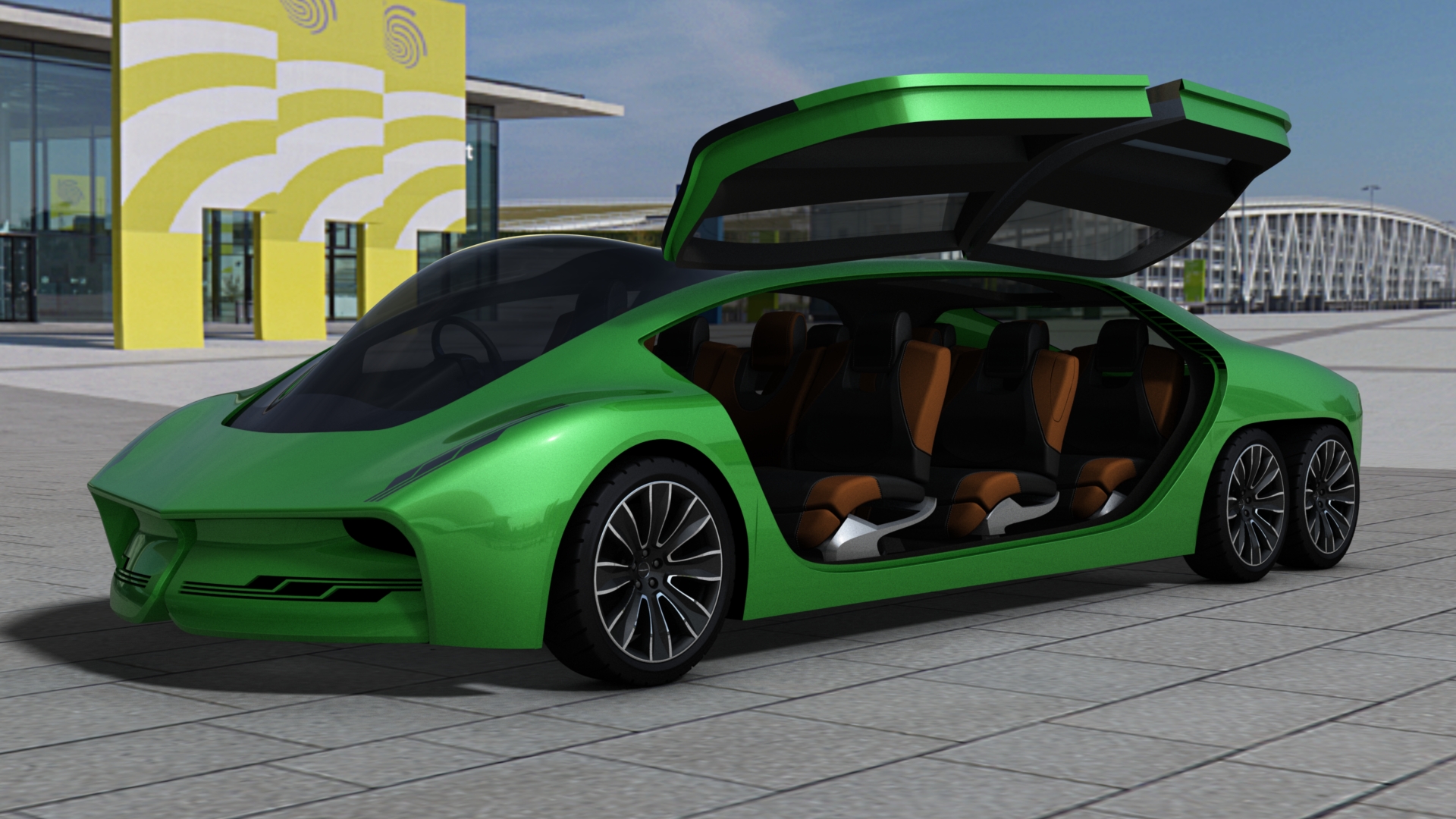 Together with George Gaffoglio from Metalcrafters Inc. we wanted to see if we could push that into a new category that would provide a unique, modern and attractive design and combine that with the need for green and clean, and add a heavy dose of user friendliness and practicality in the mix. The outcome is this sleek 9-seat vehicle with a central driving position, 3 axis of which 2 are driven in the rear by the strong electric engines.